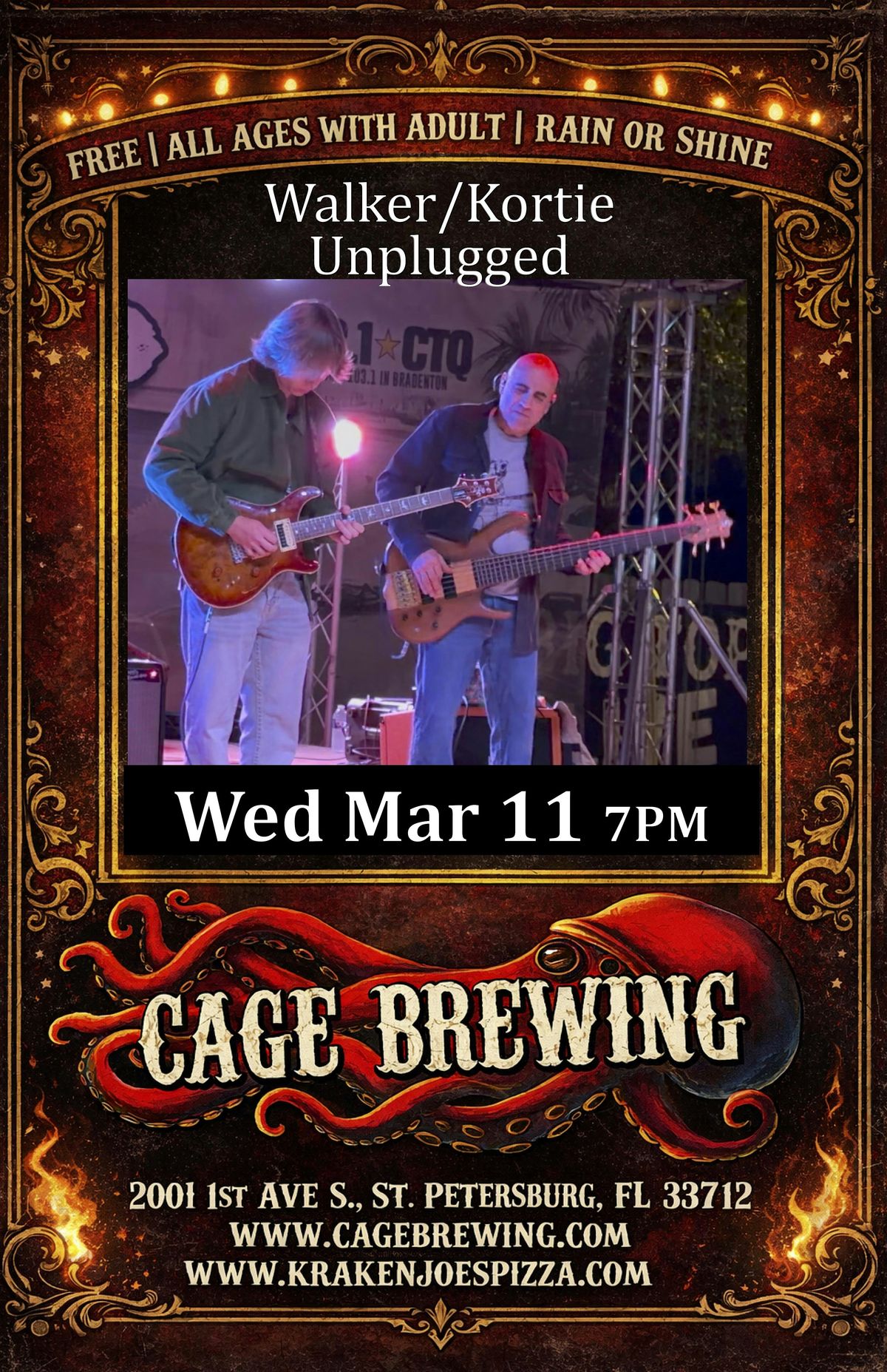 Come join us in person at Cage Brewing for an unforgettable evening featuring Steven Kortie & Christian Walker performing UNPLUGGED! Chill vibes, great tunes, and a cozy spot to hang out. Mark your calendar for WED MAR 11 and get ready for a night of awesome music and good company.