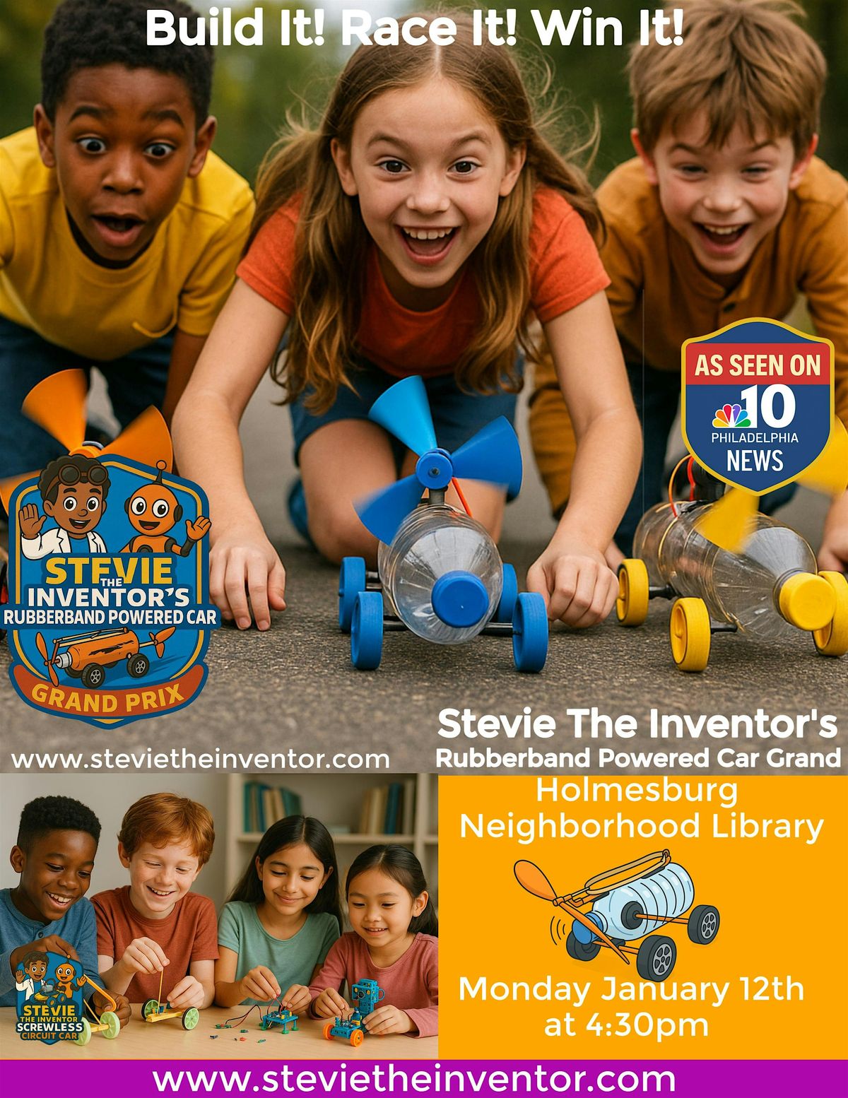 🎉 Stevie The Inventor’s Rubberband Powered Car Grand Prix is rolling into the Holmesburg Neighborhood Library! Kids will build their own cars, race them head-to-head, and learn real STEM concepts through fun competition.