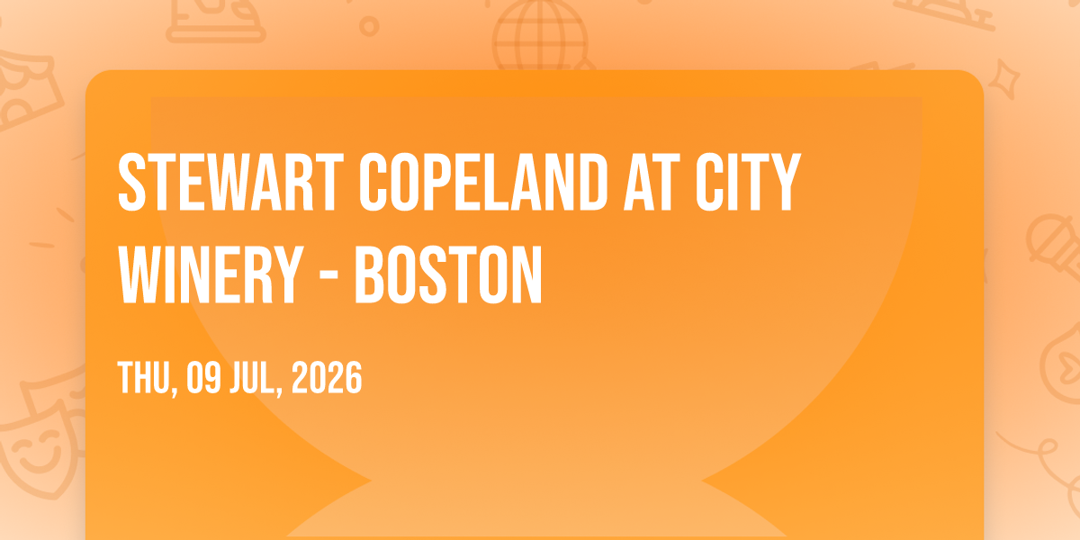 ✨ Experience the magic of Stewart Copeland at City Winery - Boston, where moments become memories that last a lifetime! 🏛️ The iconic City Winery - Boston in Boston, MA sets the perfect stage for an unforgettable celebration on July 9th, 2026 at 07:30 PM. 🌟 It's been a curated experience that brings together the best of entertainment and innovation, creating an atmosphere of wonder and excitement. From the moment you arrive, you'll be immersed in a world where the ordinary transforms into the extraordinary. 🎊 Book early to secure your place in what promises to be an event that will be talked about for years to come!