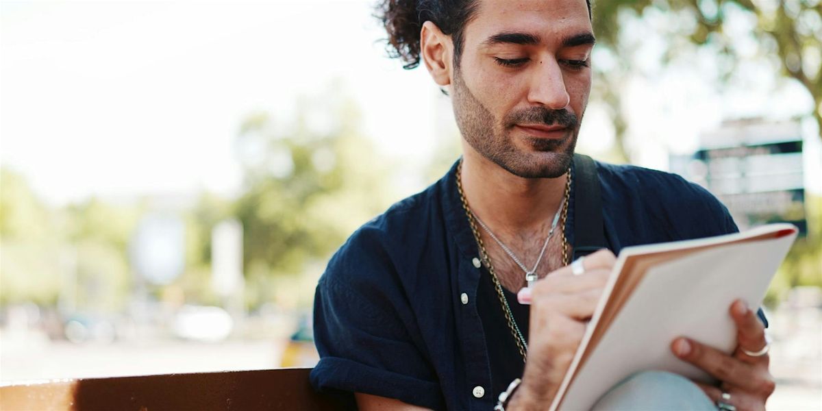 Image: A person with dark curly hair sits on a bench outside drawing in a notebook.