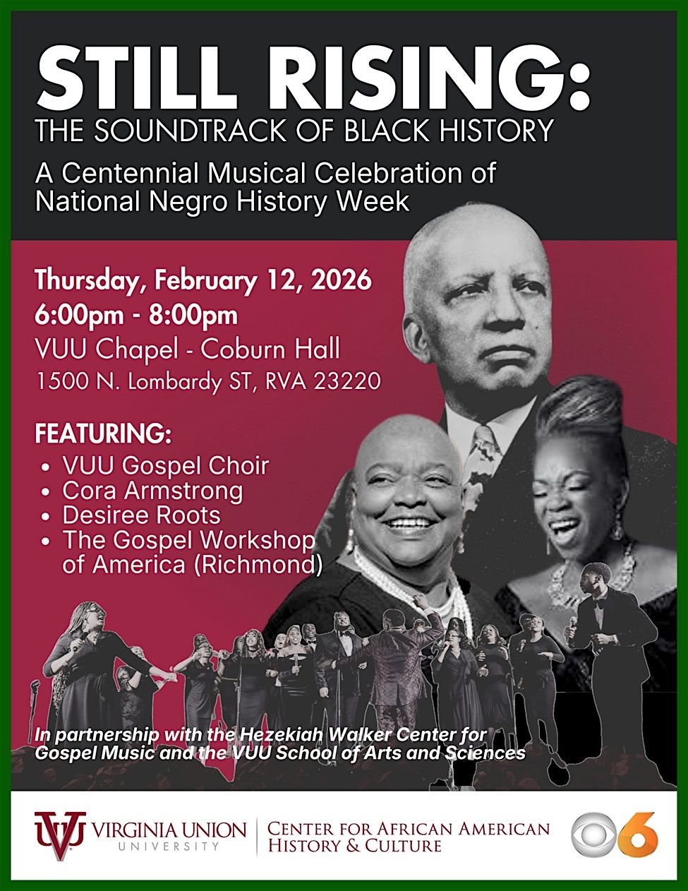 Welcome to Still Rising: The Soundtrack of Black History! Join us at Virginia Union University Chapel - Coburn Hall on February 12, 2026 at 6:00 PM for an unforgettable evening celebrating the rich musical history of the Black community. This event is a tribute to the resilience, creativity, and power of Black voices throughout history. Don't miss out on this incredible opportunity to honor and enjoy the incredible music that has defined Black culture. See you there!