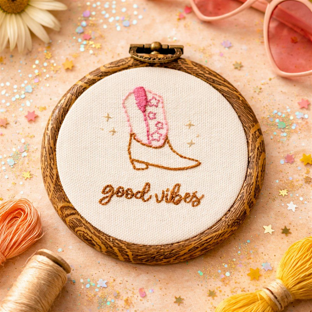 We’ll be stitching a retro-inspired “Good Vibes” design, and I’ll guide you step-by-step—so whether you’re brand new or just looking for a creative night out, you’re in the right place.