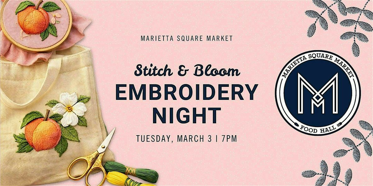 Join us on Tuesday, March 3rd at 7PM for a hands-on creative workshop hosted by Marietta Craft Club. Attendees will paint and embroider a custom tote bag, choosing between a peach or dogwood flower design and adding their name.