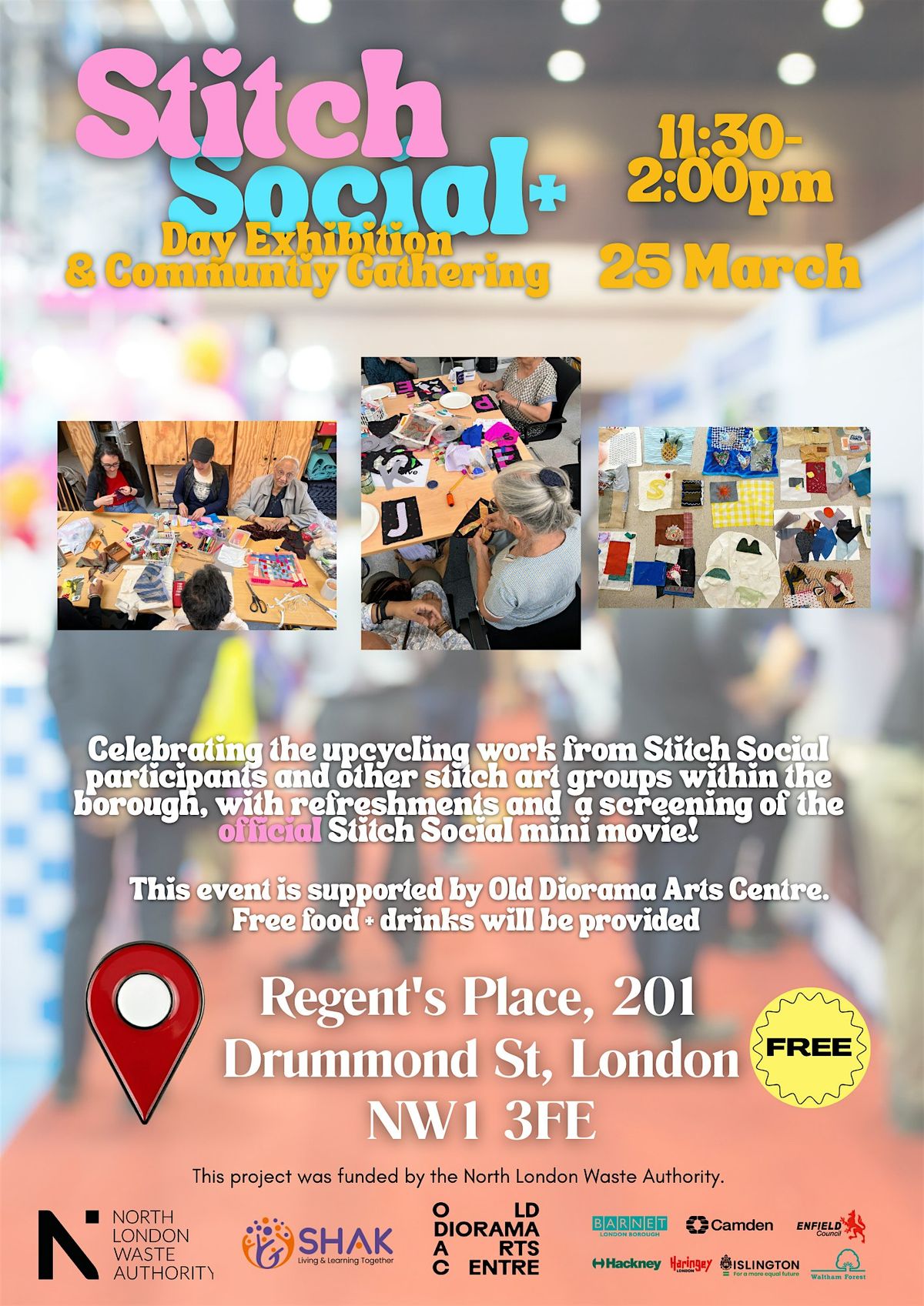 Join us at the Old Diorama Arts Centre on March 25, 2026 at 11:30 AM (GMT) for a fun and creative day! This exhibition celebrates the art of stitching with a community twist. Whether you're a stitch pro or just curious, come check out amazing pieces, meet fellow art lovers, and enjoy some relaxed vibes with some nice food and refreshments.