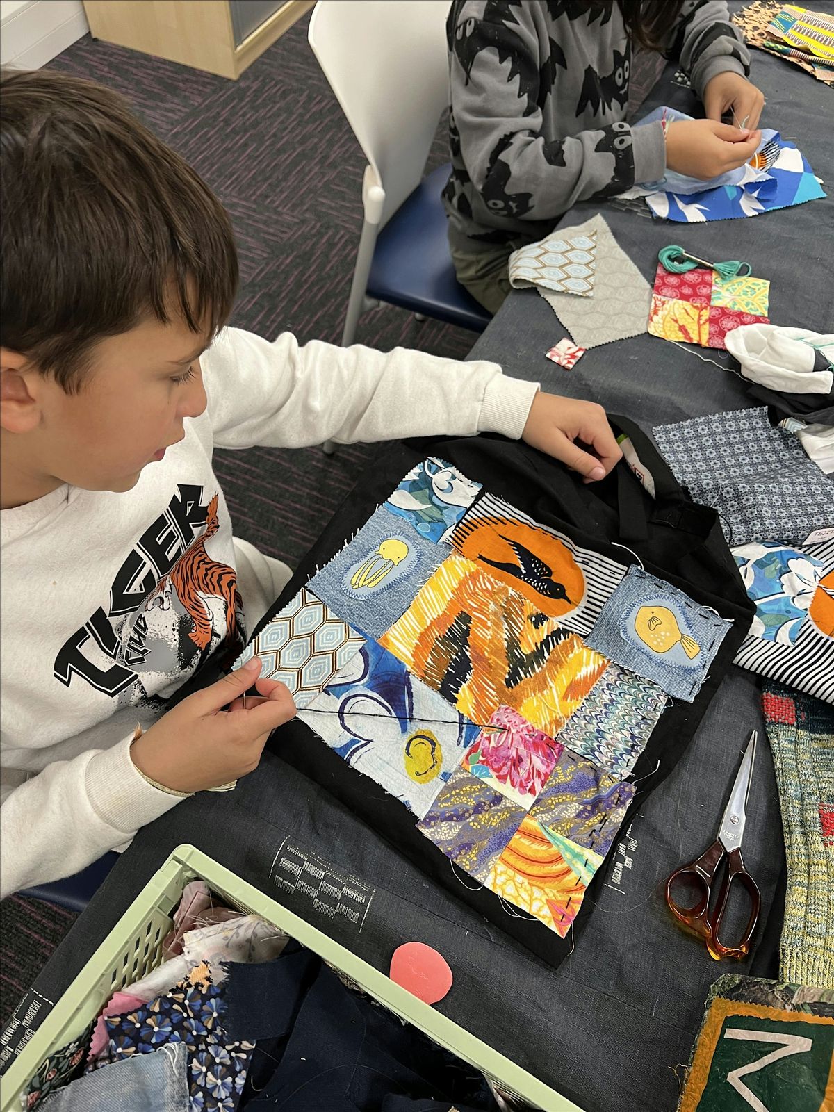 Bring a tote bag from home and choose from a collection of rescued fabrics to cut shapes, layer colours, and stitch your design together.