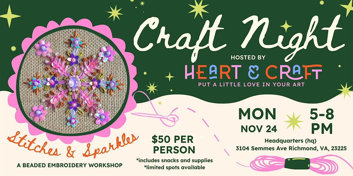 The holidays are right around the corner, and what better way to add a little sparkle to the season than by creating something handmade? Join us for a relaxing, creative workshop hosted by Emma Neuhaus, art instructor and owner of Heart & Craft. You’ll design your own stitched snowflake using beaded embroidery techniques. It's the perfect addition to your holiday decor or can be treasured as a heartfelt, handmade gift.