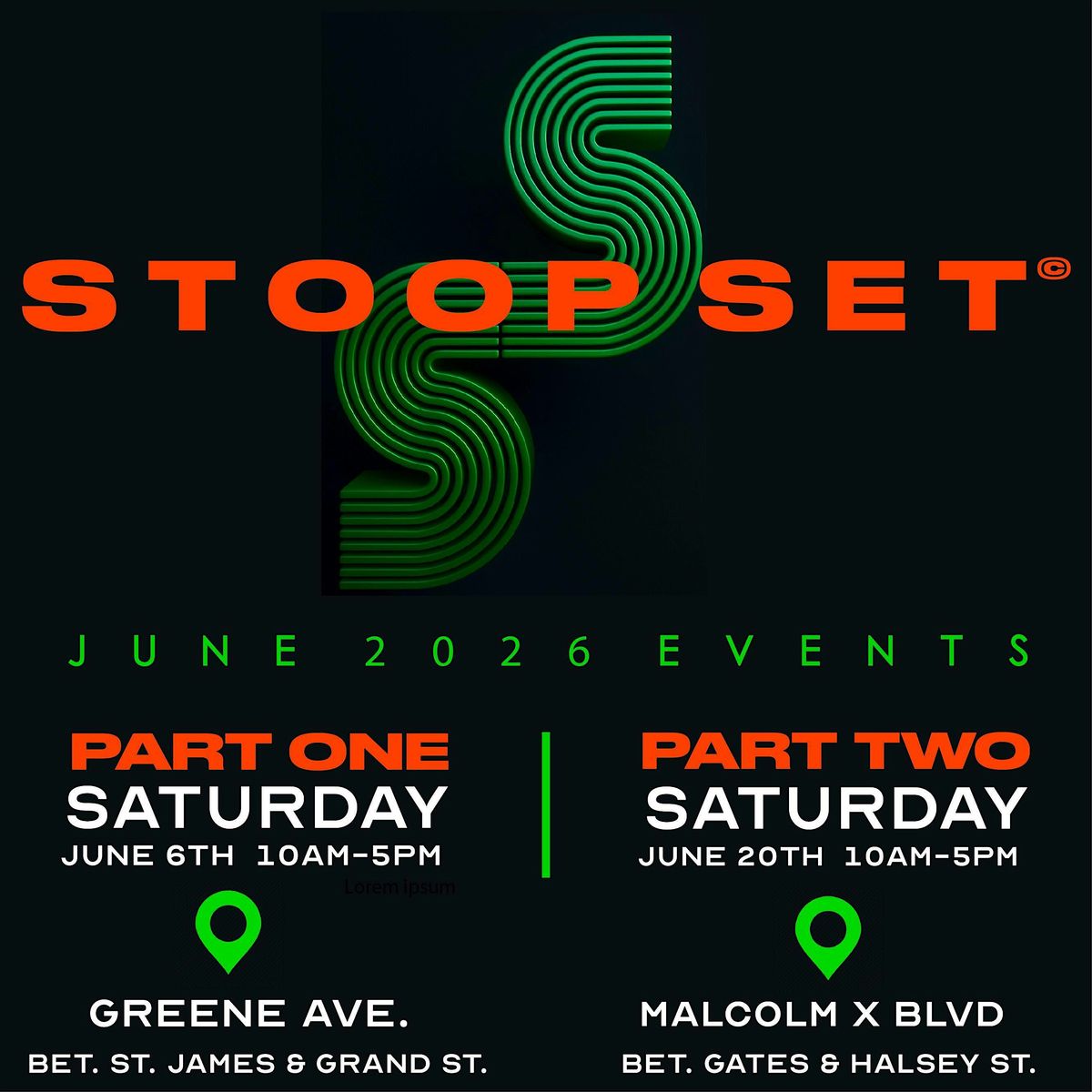 The Block Association & Good People NYC presents the 4th Annual "STOOP SET" on Saturday June 6, 2026 from 10am - 5pm. This year DUE TO POPULAR DEMAND We will be extending the block to Grand Street on Greene Avenue. We will have music by DJ KORREK . The streets will be open for Family fun , shopping , eating , cocktails , live performance and dancing. Come out and enjoy a new experience that only "STOOP SET" can deliver.