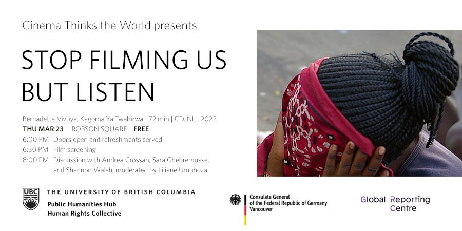 Cinema Thinks the World is pleased to partner with the Consulate General of the Federal Republic of Germany for Vancouver, the UBC Human Rights Collective, the Global Reporting Centre, and UBC-V Public Humanities Hub to present a free screening of Stop Filming Us But Listen, followed by a discussion about the film with UBC scholars Andrea Crossan (Global Reporting Centre), Sara Ghebremusse (Law) and Shannon Walsh (Film Production), moderated by Liliane Umuhoza (MA Student, School of Public Policy and Global Affairs).About the film: