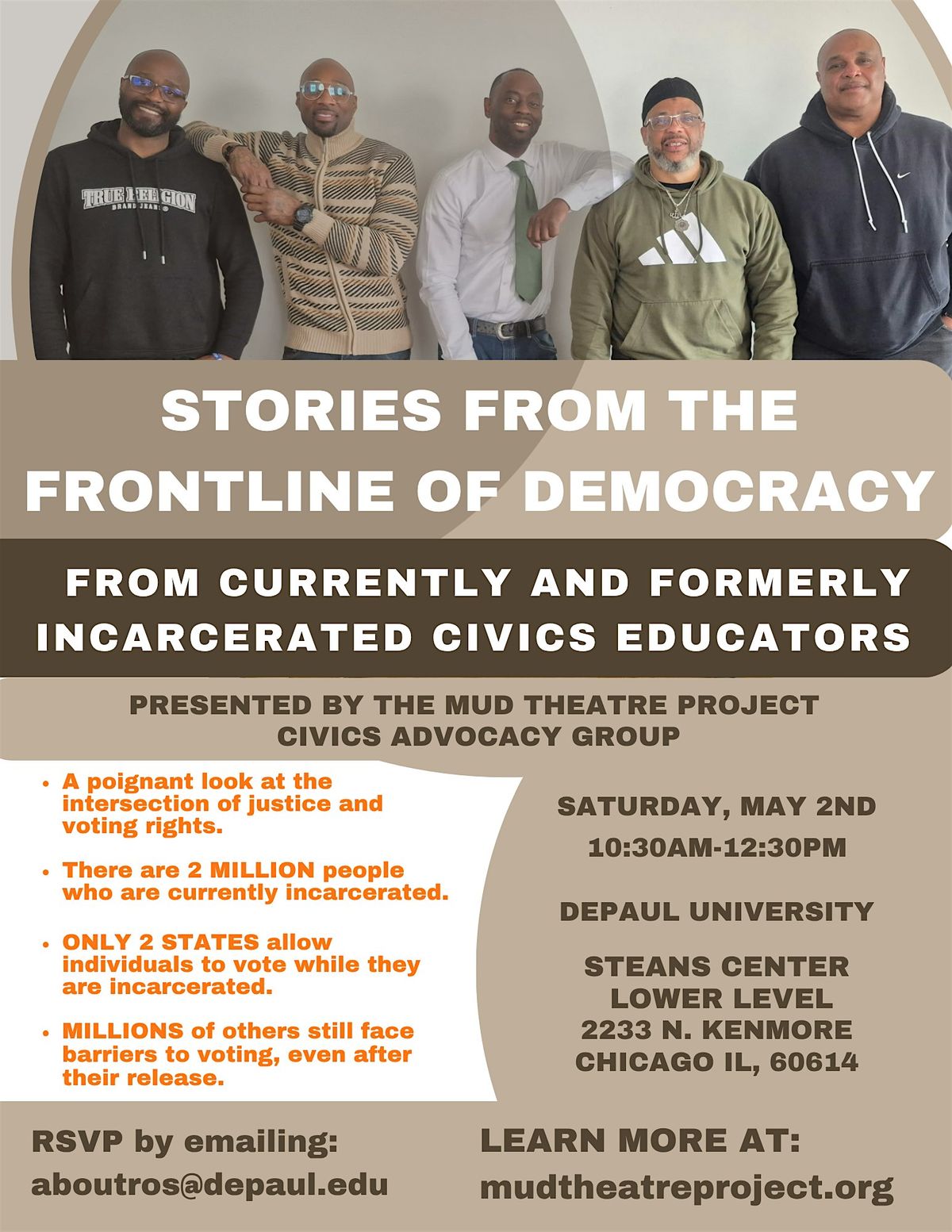 Stories From The Frontline of Democracy, From Currently and formerly incarcerated Civics Educators, PRESENTED BY THE MUD THEATRE PROJECT