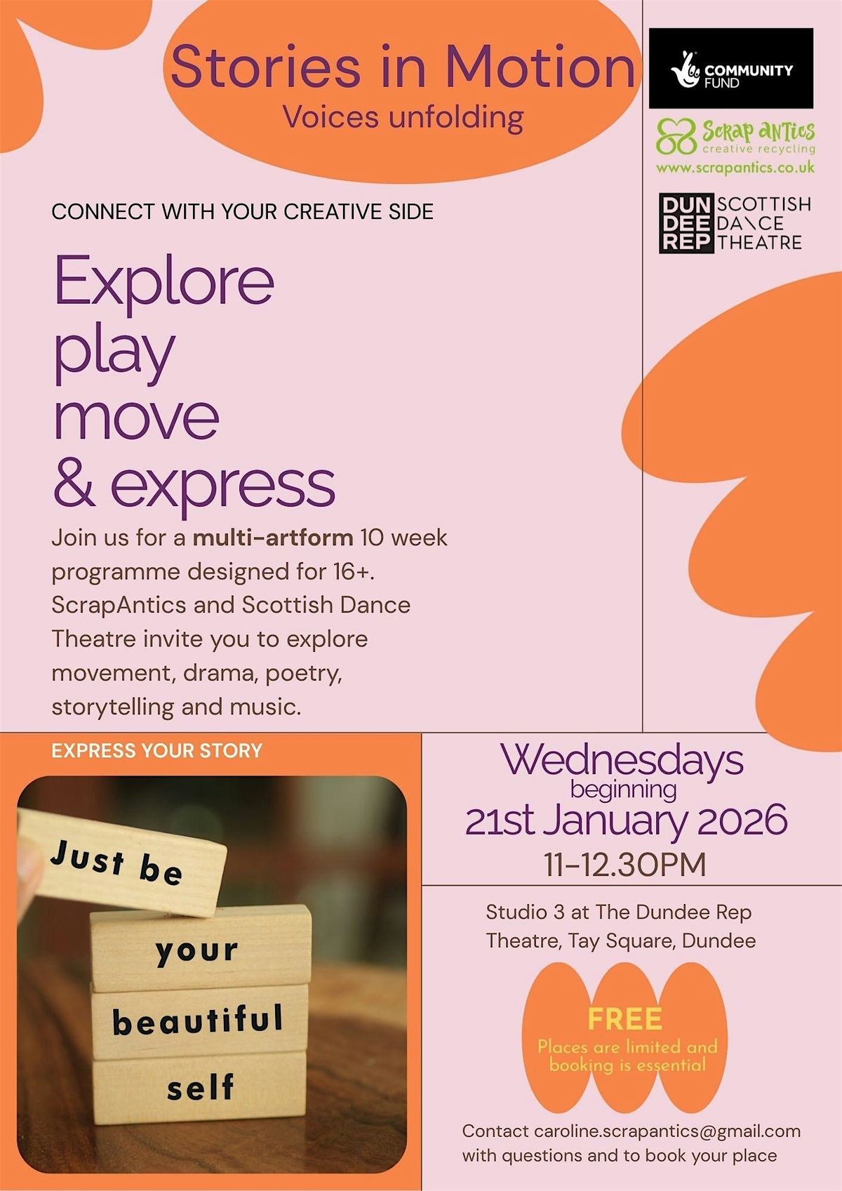 Join us for a multi-artform 10 week programme designed for 16+. ScrapAntics and Scottish Dance Theatre invite you to explore movement, drama, poetry, storytelling and music.