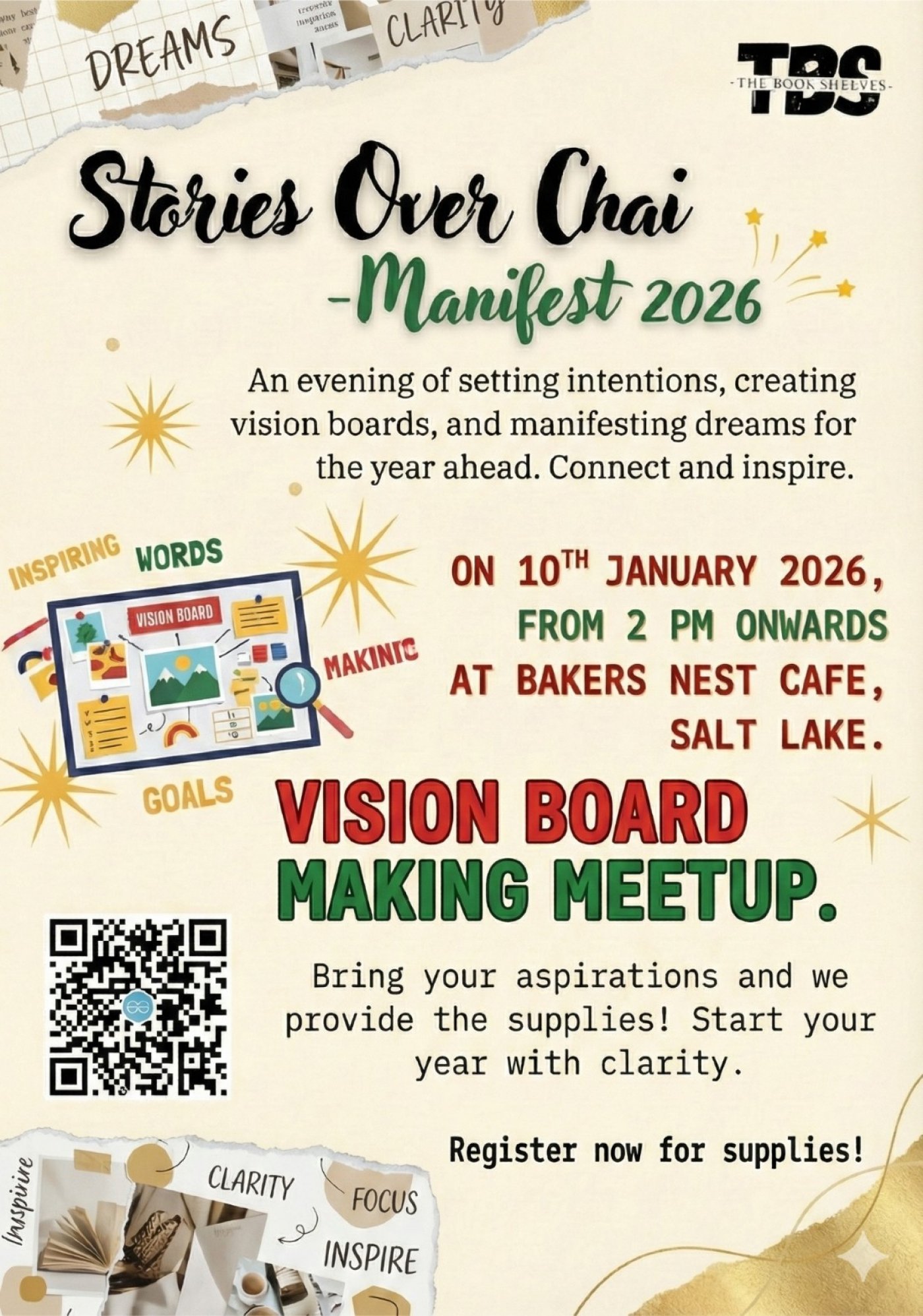 Join us for an intimate afternoon where dreams meet clarity and creativity turns into intention. At Stories Over Chai – Manifest 2026, we come together as a community to pause, reflect, and visually map out the life we want to build in the coming year.