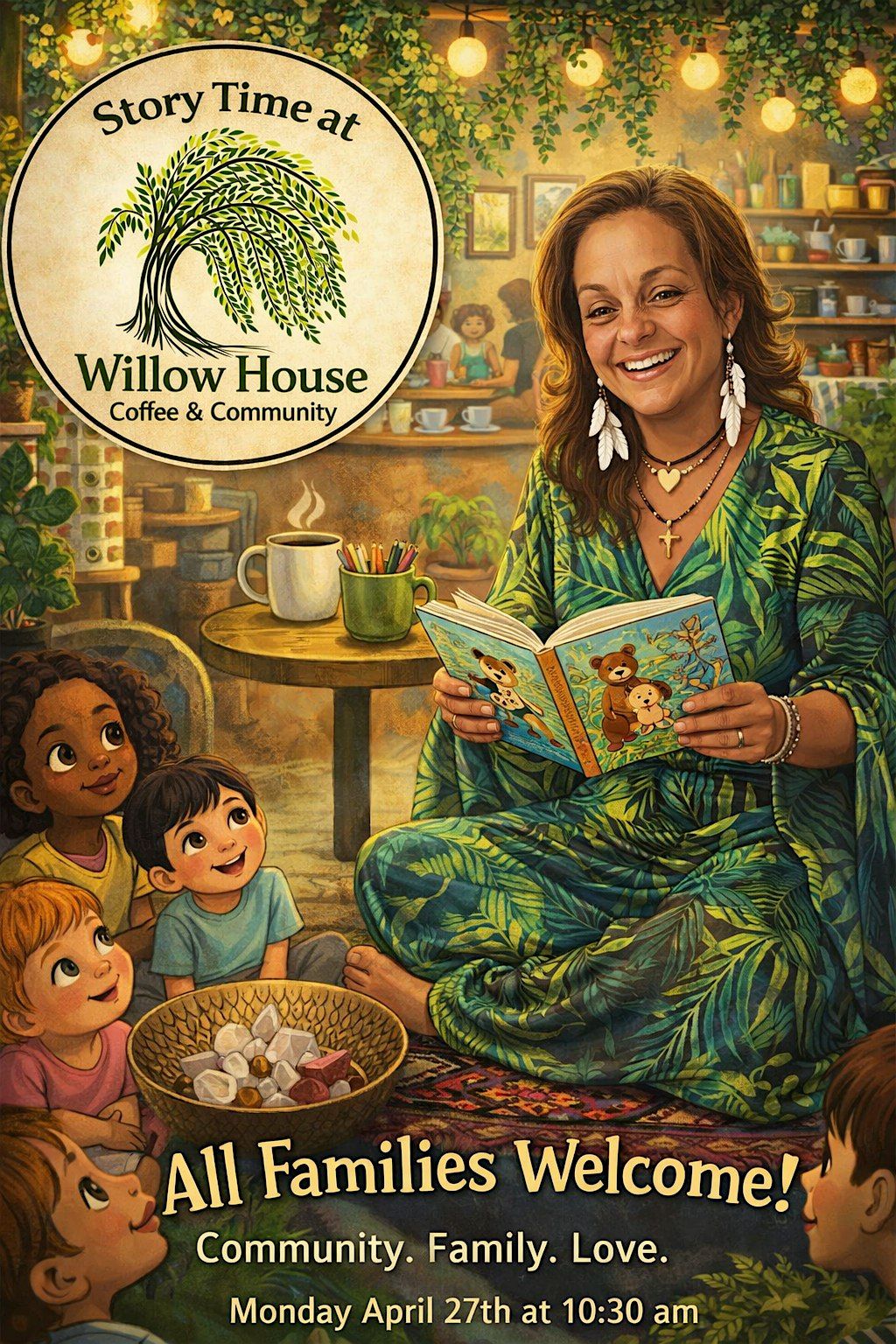 She is honored to host Story Time at Willow House, a space for cultivating authentic connection and belonging; where community and families of all kinds are always welcome.