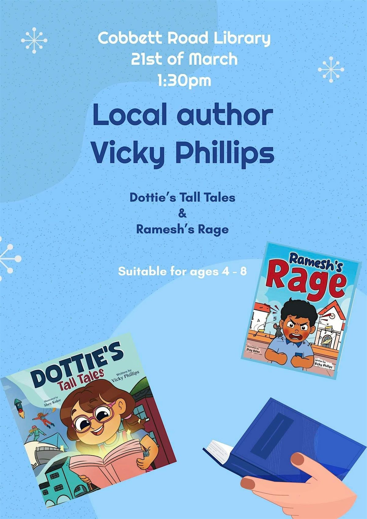 Join us for a fun, in-person story time featuring Vicky Phillips, a favorite local kids' author! Dive into her imaginative tales, enjoy some laughs, and get inspired by her creative world. Perfect for young readers and families looking for a cozy, interactive storytelling experience. Don’t miss out on this awesome chance to meet Vicky and hear stories up close! will also be selling her books after the event