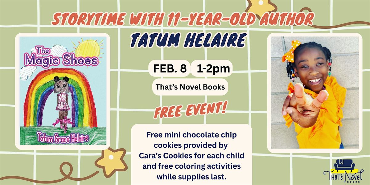 Join us in celebrating That’s Novel’s youngest author event yet! Tatum Helaire is an 11-year-old who recently wrote, illustrated and published her first ever book, The Magic Shoes. We can’t wait to celebrate her accomplishment with a story time reading done by her! We’ll also have coloring stations set up for kids after the story time and our neighbors at Cara’s Cookies are donating free mini chocolate chip cookies for each child (while supplies last). Copies of Tatum’s book will be available for purchase! No RSVP is needed for this event. Just show up and help support a young local author!