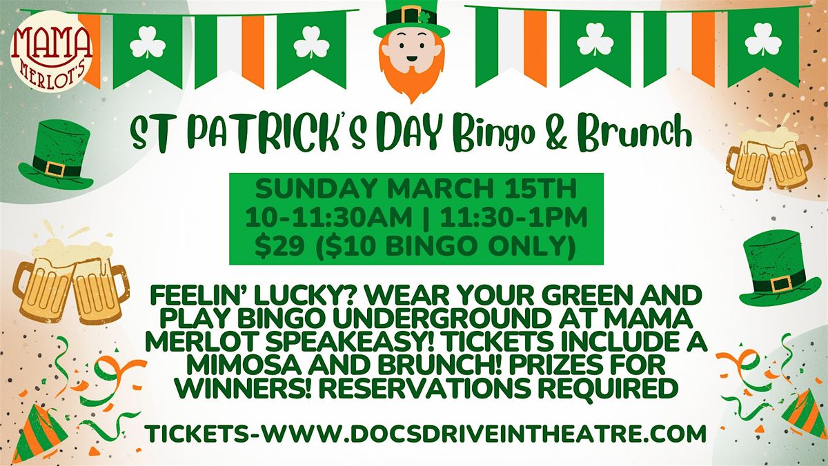 Welcome to St.Patrick's Day Bingo & Brunch at the Speakeasy! π Join us at Mama Merlot's Speakeasy on March 15, 2026 at 10:00 AM or 11:30am for a fun-filled event!