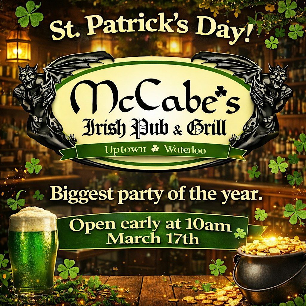 Get ready to celebrate St. Patrick's Day like never before! Swing by McCabe's Waterloo for an epic in-person bash filled with IRISH PARTY FAVORS, IRISH vibes, IRISH food, and lots of fun. It's the perfect spot to rock your green gear, enjoy some tunes, green drinks, and soak up the IRISH spirit. Open at 10am. Ask for our daily special: Bowl of Lucky Charms!