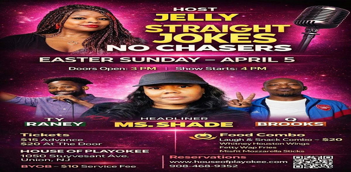 Get ready to laugh LOUD this Easter Sunday at Straight Jokes No Chasers Comedy Show hosted by Jelly!