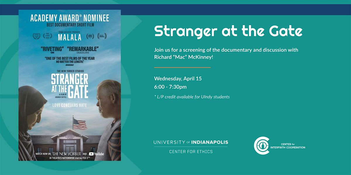 Join the Center for Interfaith Cooperation and the University of Indianpolis' Center for Ethics for a screening of the documentary Stranger at the Gate followed by a discussion with Richard "Mac" McKinney.
