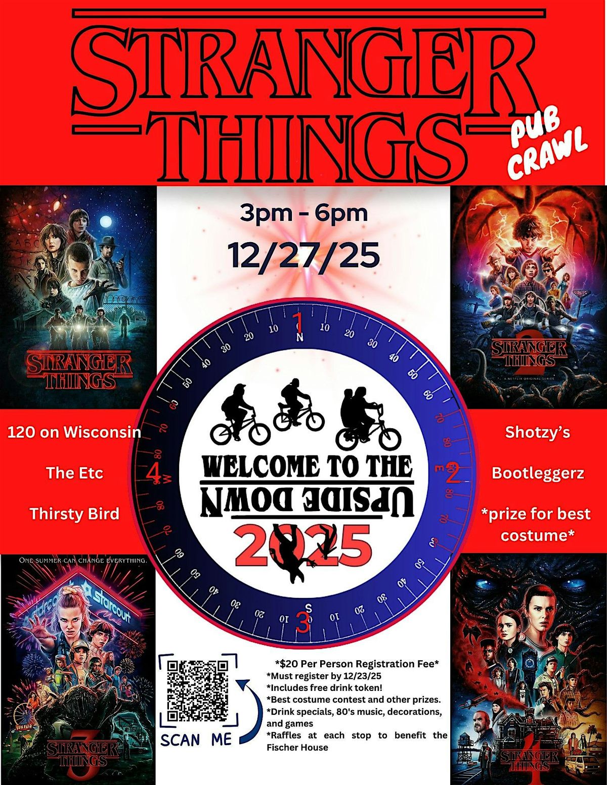 Welcome to the Stranger Things - Oconomowoc Pub Crawl! Join us at registration check in at The Etcetera Bar and Grill for a night of fun, drinks, and nostalgia. Dress up as your favorite character from the hit show and enjoy themed drinks and activities at each stop along the crawl. Whether you're a fan of Eleven, Mike, or even the Demogorgon, there's something for everyone at this event. Get ready to explore Oconomowoc in a whole new way and make some new friends along the journey. Don't miss out on this unique experience - see you there!