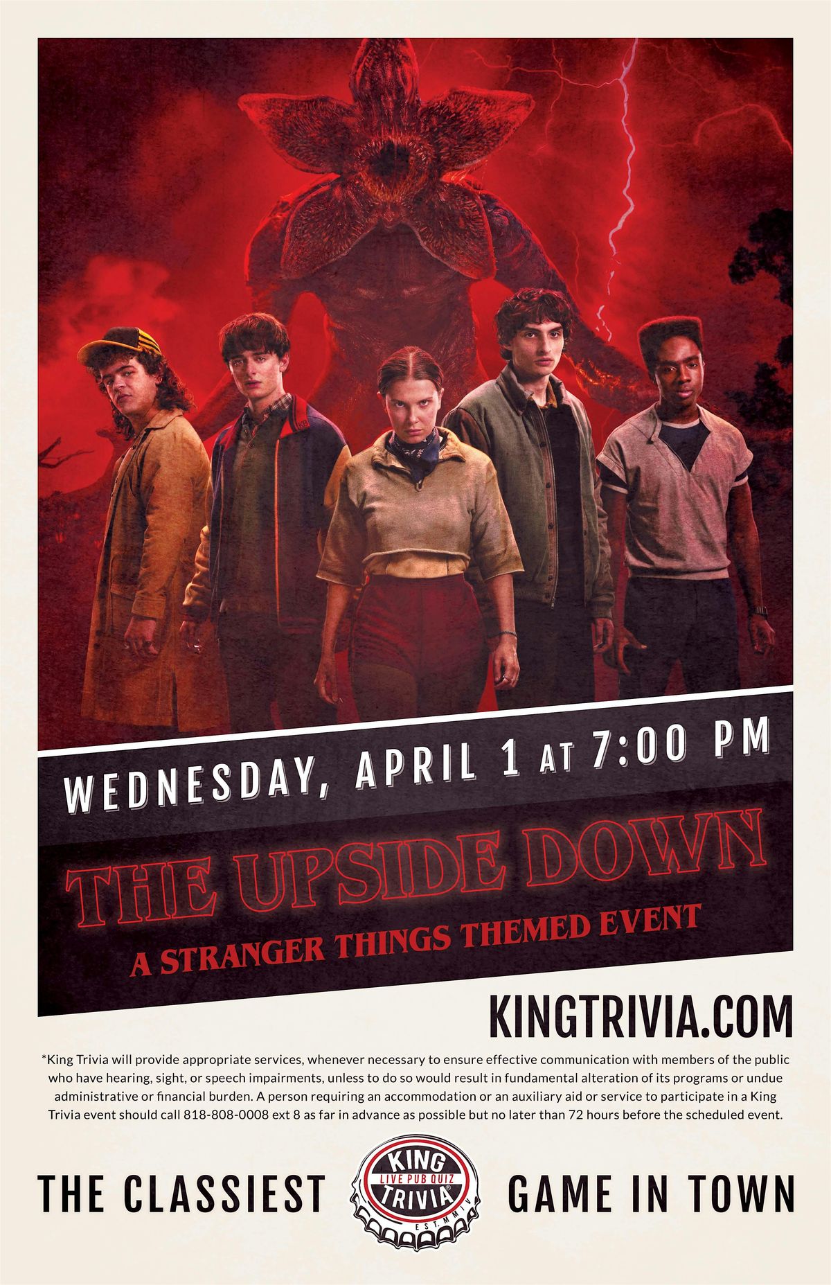 Get ready to test your knowledge of the Upside Down at our Stranger Things Trivia Night! Join us in person at Revolution Golf and Grille for a night full of fun, laughs, and challenging questions about your favorite show. Bring your friends, show off your skills, and maybe even discover some hidden Eleven powers! Don’t miss out on this awesome evening – see you there!