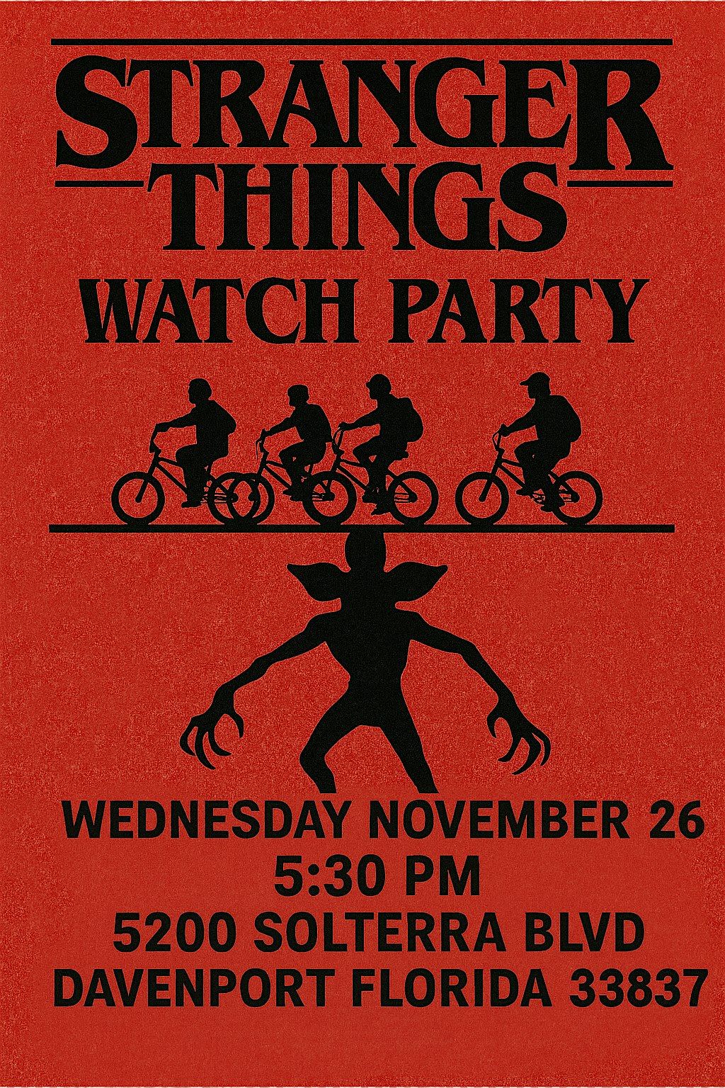 Come join us as we watch season 5 Stranger things. Eat inspired food and games from the series. Win prizes during trivia and more.