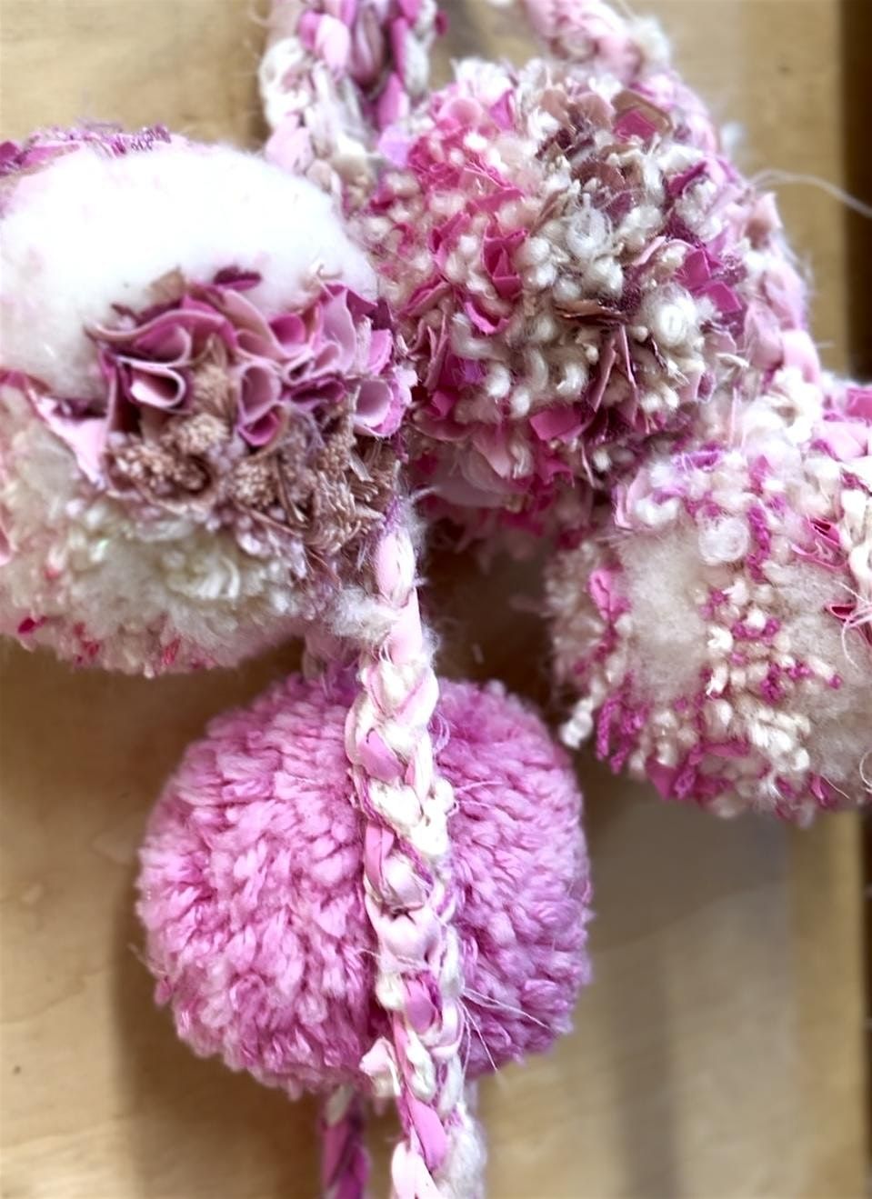 We'll be making these garlands in my quintessential style of blending vintage fabrics and yarns, and transforming upcycled materials into luscious adornment for your homes. All the pinks we'll be using will be hand-dyed by me out of vintage fabrics and yarns curated from my extensive collection.
