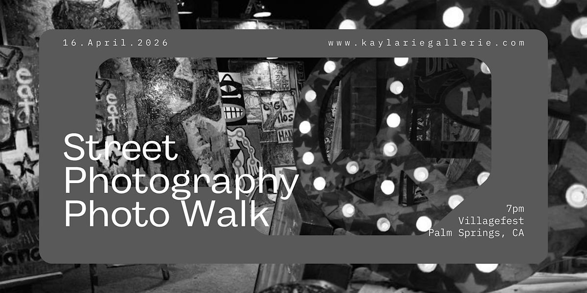 Join Kaylarie Gallerie at the Palm Springs Villagefest, April 16, 2026 at 7pm, for an evening of learning about street photography. Discuss capturing candid moments, composing for storytelling and ethical photos.