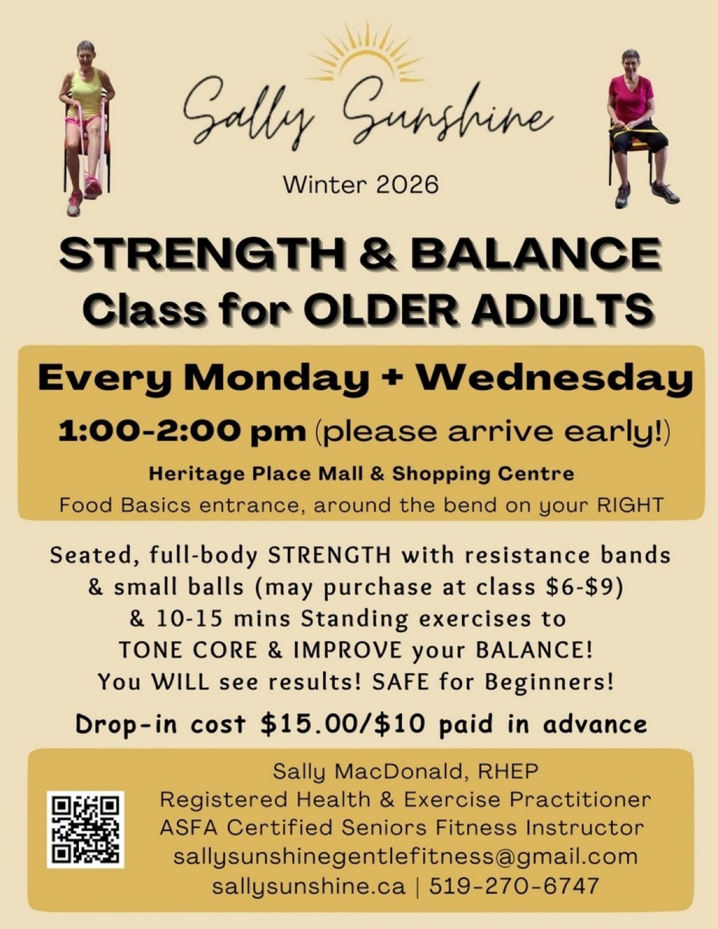 My Strength & Balance Class for Older Adults runs every Monday and Wednesday from 1:00 pm to 2:00 pm in Owen Sound at the Heritage Place Mall & Shopping Centre, located near the Food Basics entrance — around the bend on your right. Please plan to arrive a few minutes early.