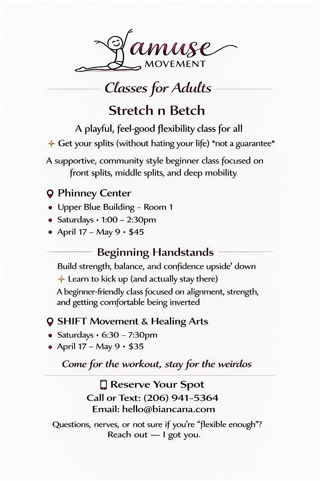 A supportive, community-style beginner class focused onfront splits, middle splits, and deep mobility