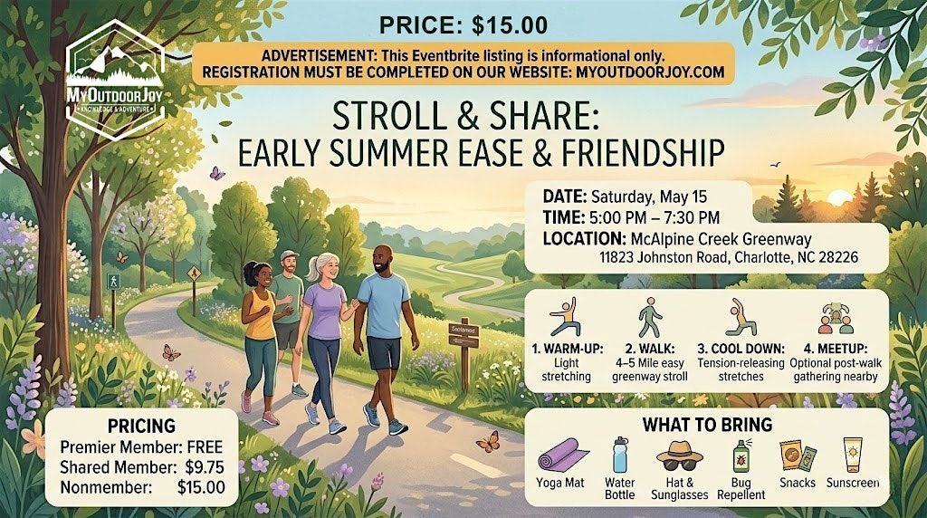 We’ll gather at the beautiful McAlpine Creek Greenway for a balanced evening of movement and community: