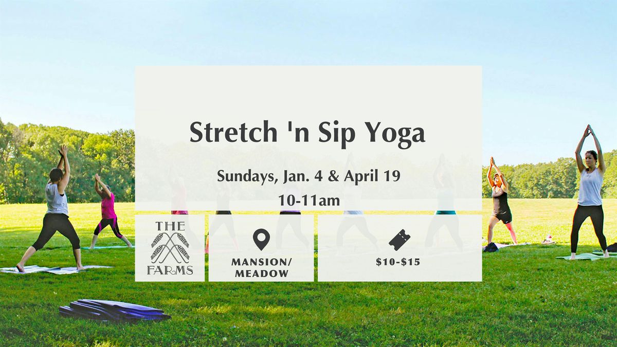 Make time for some moving meditation followed by a drink and conversation at Stretch ‘n Sip Yoga on Sundays, Jan 4 () and April 19 () from 10-11 a.m.