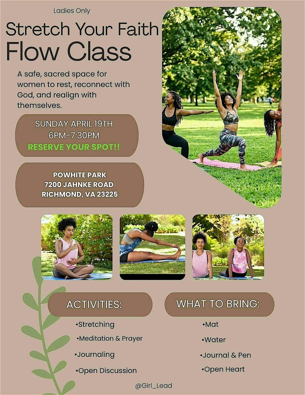 A 90-minute holistic experience for ladies to unwind and uplift. Blending low impact stretching with prayer, meditation, and journaling.