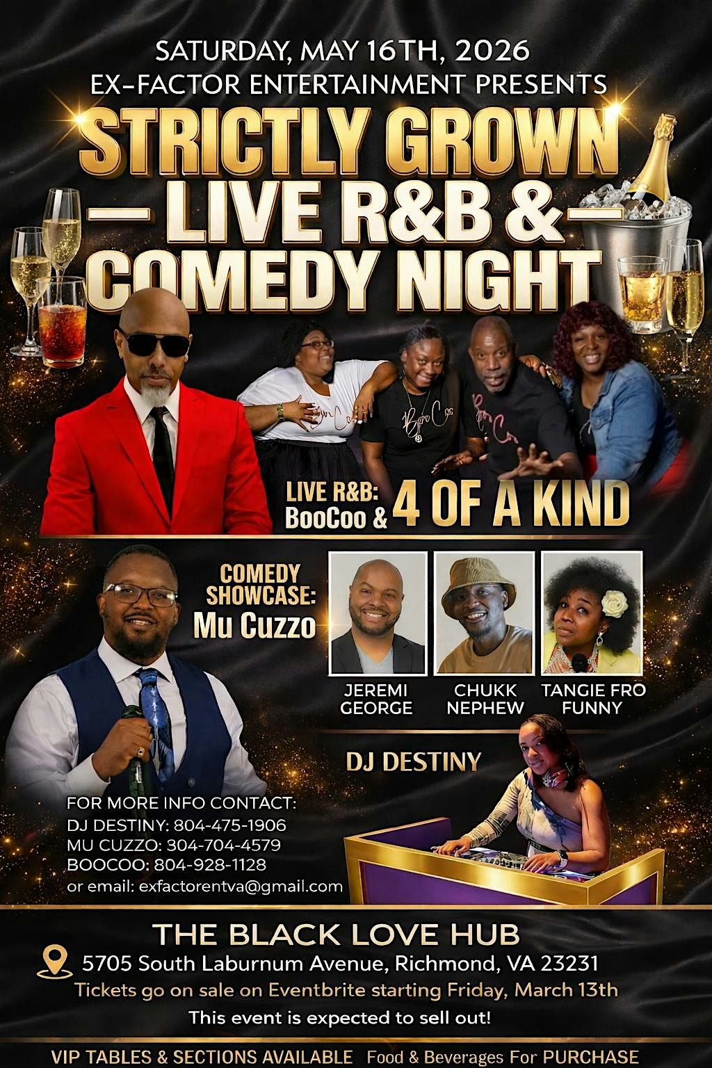 Ex-Factor Entertainment Presents: Strictly Grown – Live R&B & Comedy Night! Get ready for an unforgettable evening of live music, laughter, and great vibes!