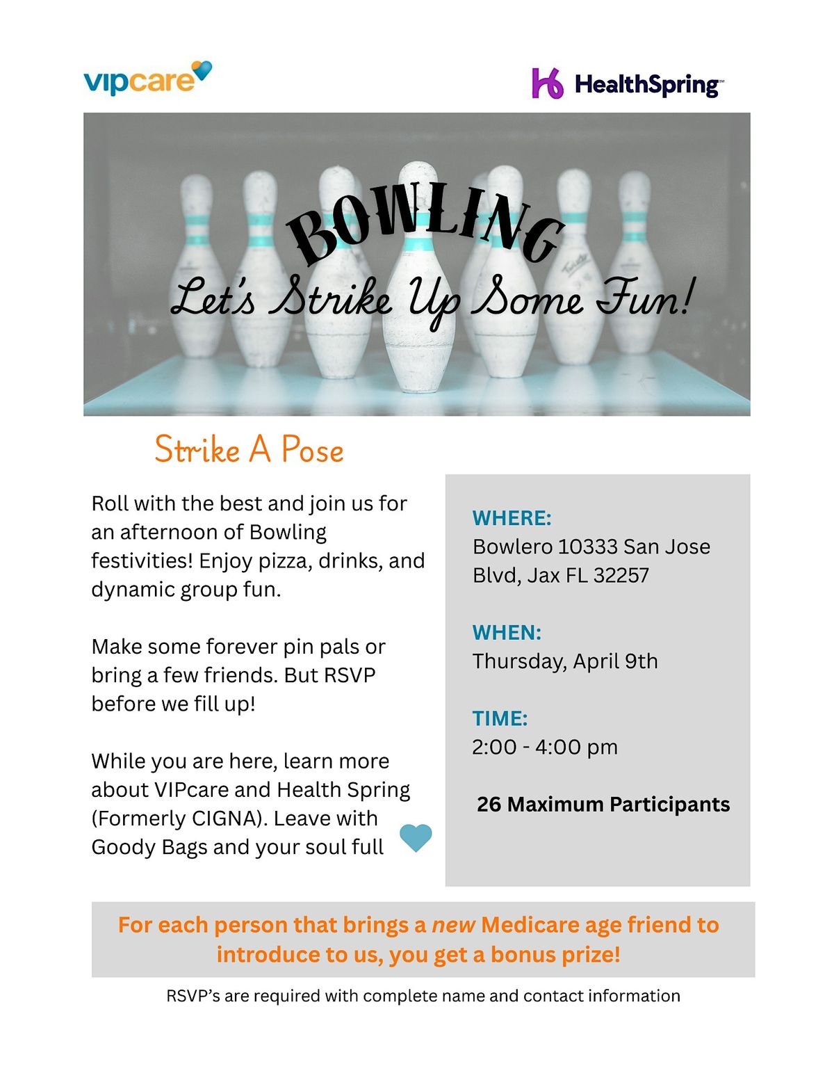 This is a special event exclusively for those age 64plus. You wil enjoy an afternoon of bowling fun, food, and soft drinks. While you are here, you wil also learn about VIPcare and HealthSpring. VIPcare is senior focused primary care providing the time and attention you deserve in small settings. HealthSpring (Formally CIGNA) provides Medicare options to suit your specific needs.