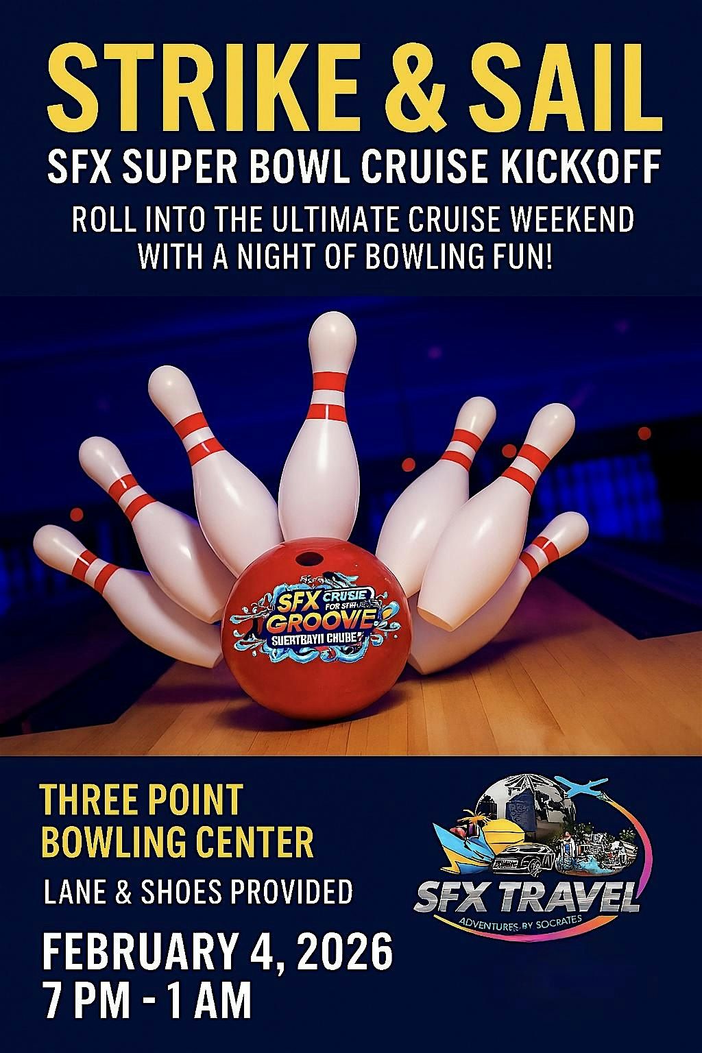 Set your Super Bowl Cruise weekend in motion and join the SFX Travel family at Three Point Bowling Center—where the lights glow, the beats drop, and every strike sparks a cheer. Lane and shoe rental are included, so just show up ready to roll, mingle with fellow cruisers, and build the hype before we set sail. Grab your spot now and start the party a night early!