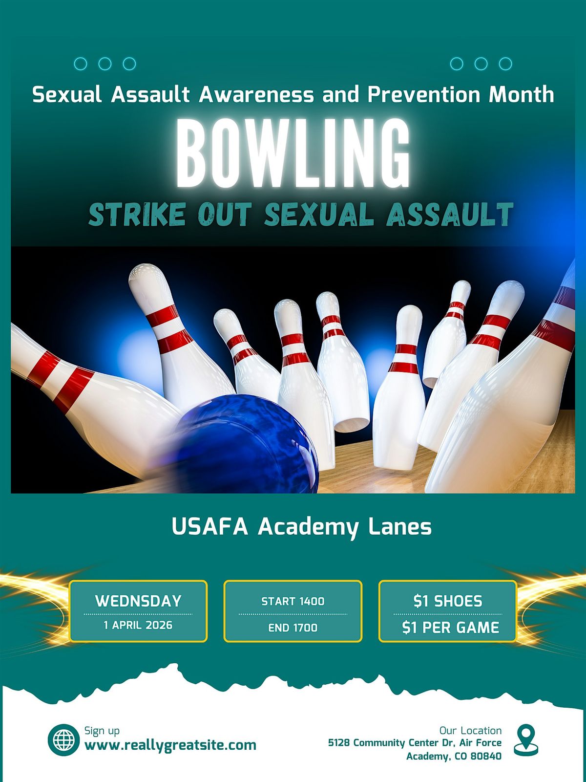A collaborative event between the SAPR Office,Chaplain, and the Bowling Center to stand in solidarityagainst sexual violence. Participants will bowl while receivingsexual assault prevention messaging and resource information.
