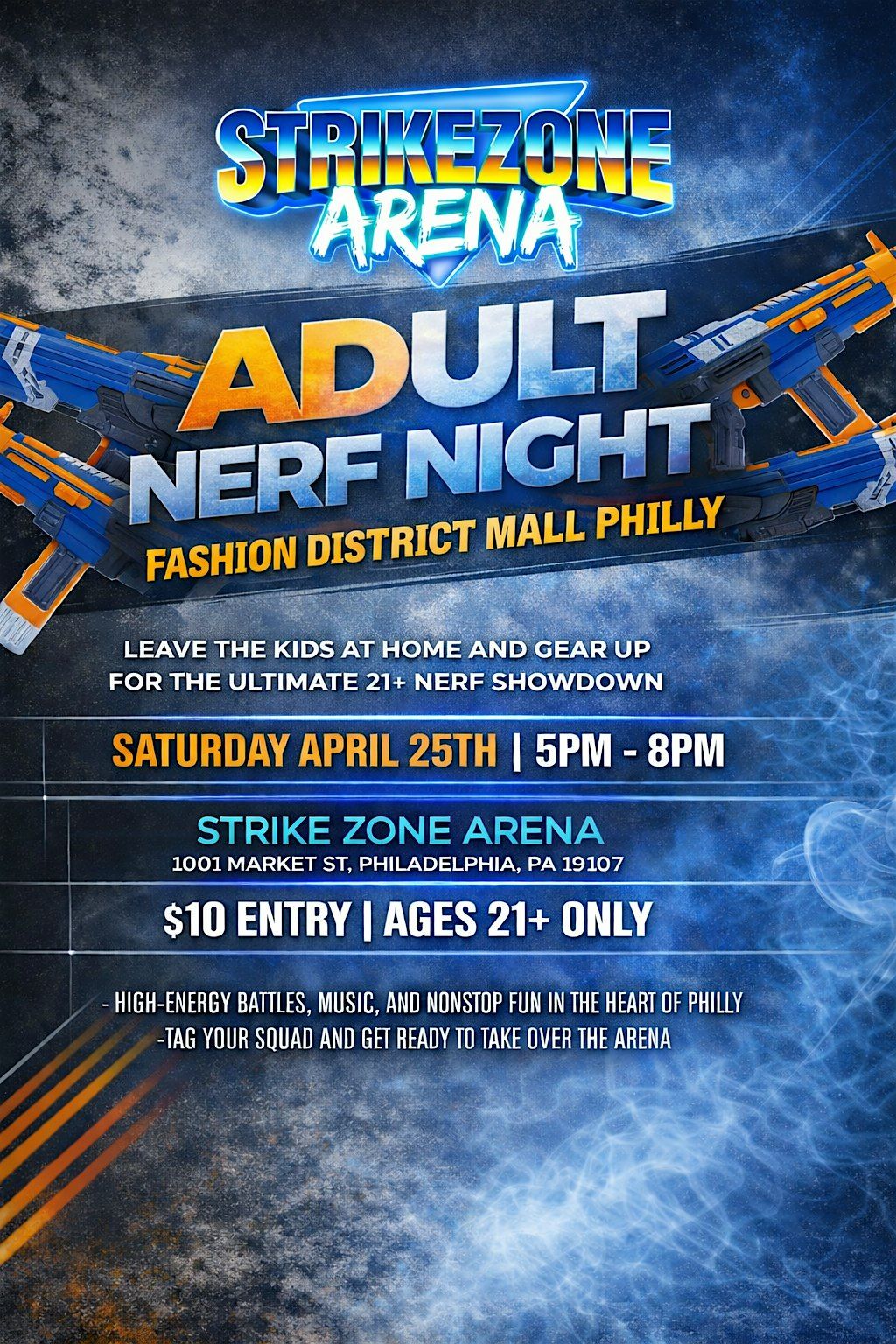 Get ready for a night full of fun and friendly competition at Strike Zone Arena! Join us on April 25, 2026, at 5:00 PM (Eastern Time) for an epic adult Nerf battle. Whether you're a Nerf pro or just looking to have a blast, this event at 1001 Market St is the perfect way to unwind and meet new people. Bring your A-game and let's make some memories!