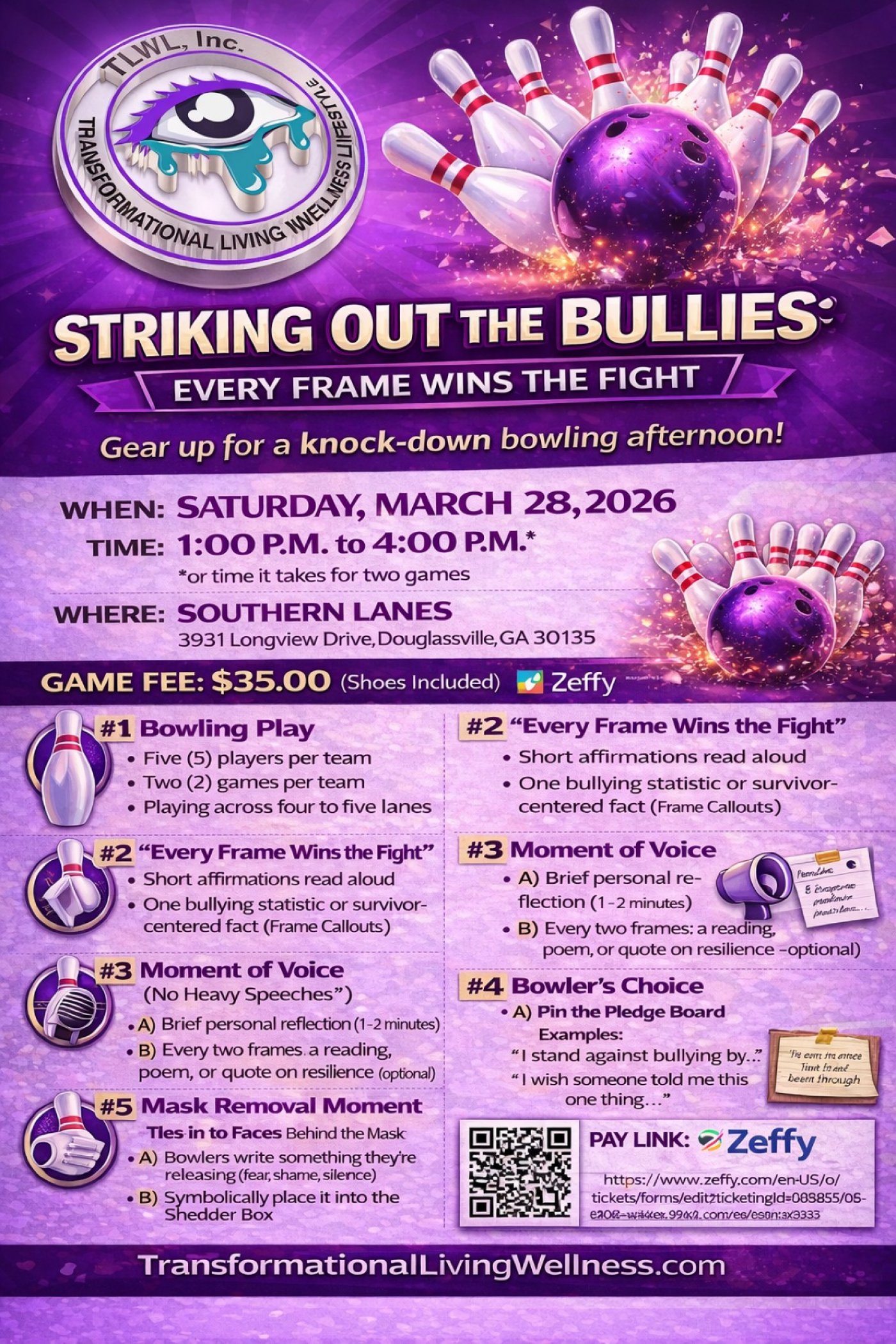 By welcoming our children to participate, we are planting seeds early—teaching them empathy, courage, and the power of unity. We leave no stone unturned since awareness, education, and action must reach every age, every family, and every corner of our community. We are confident the little ones will love to bowl. Bring them and let them knock down those bullies.
