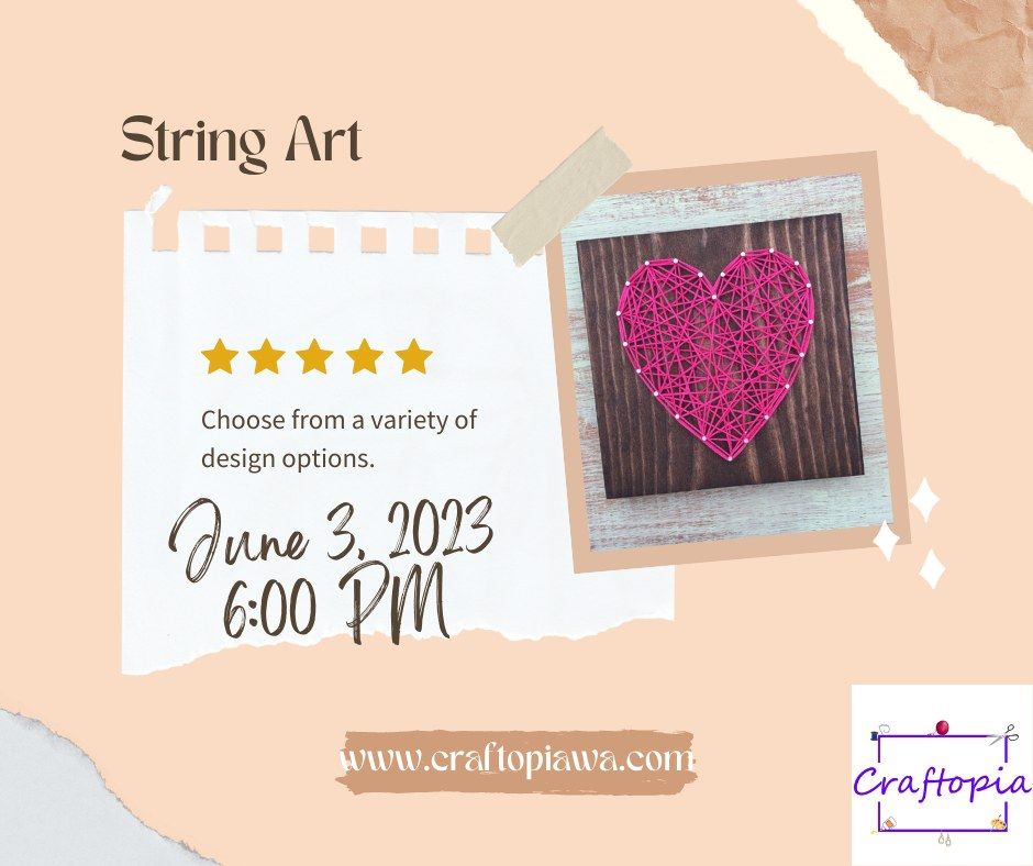 Make your very own string art creation! Learners will get the chance to choose from several different basic string art shapes, will pick their base and learn how to create their frame, then will wrap their way to their very own work of string art. $15 per person. Recommended for ages 14+. This class involves the use of hammers and nails.Register at www.craftopiawa.com