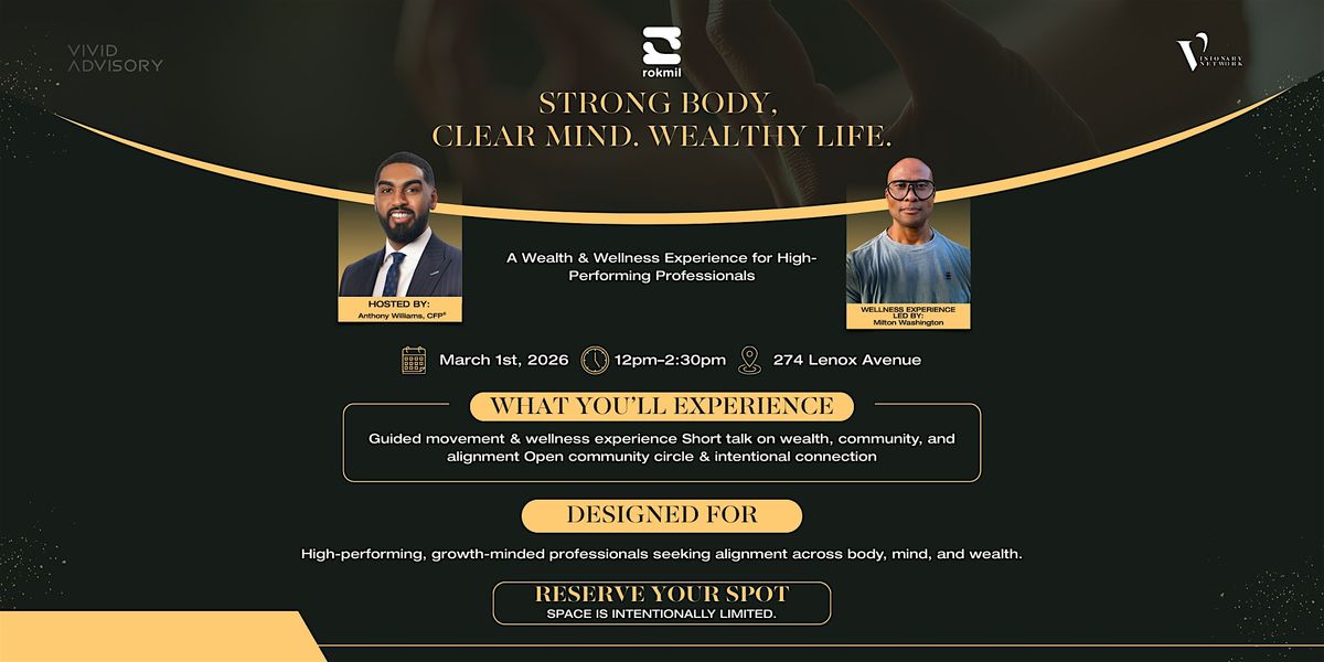 Strong Body. Clear Mind. Wealthy Life. is a monthly community experience designed for high-achieving professionals who want to align their financial well-being with their physical and mental wellness.