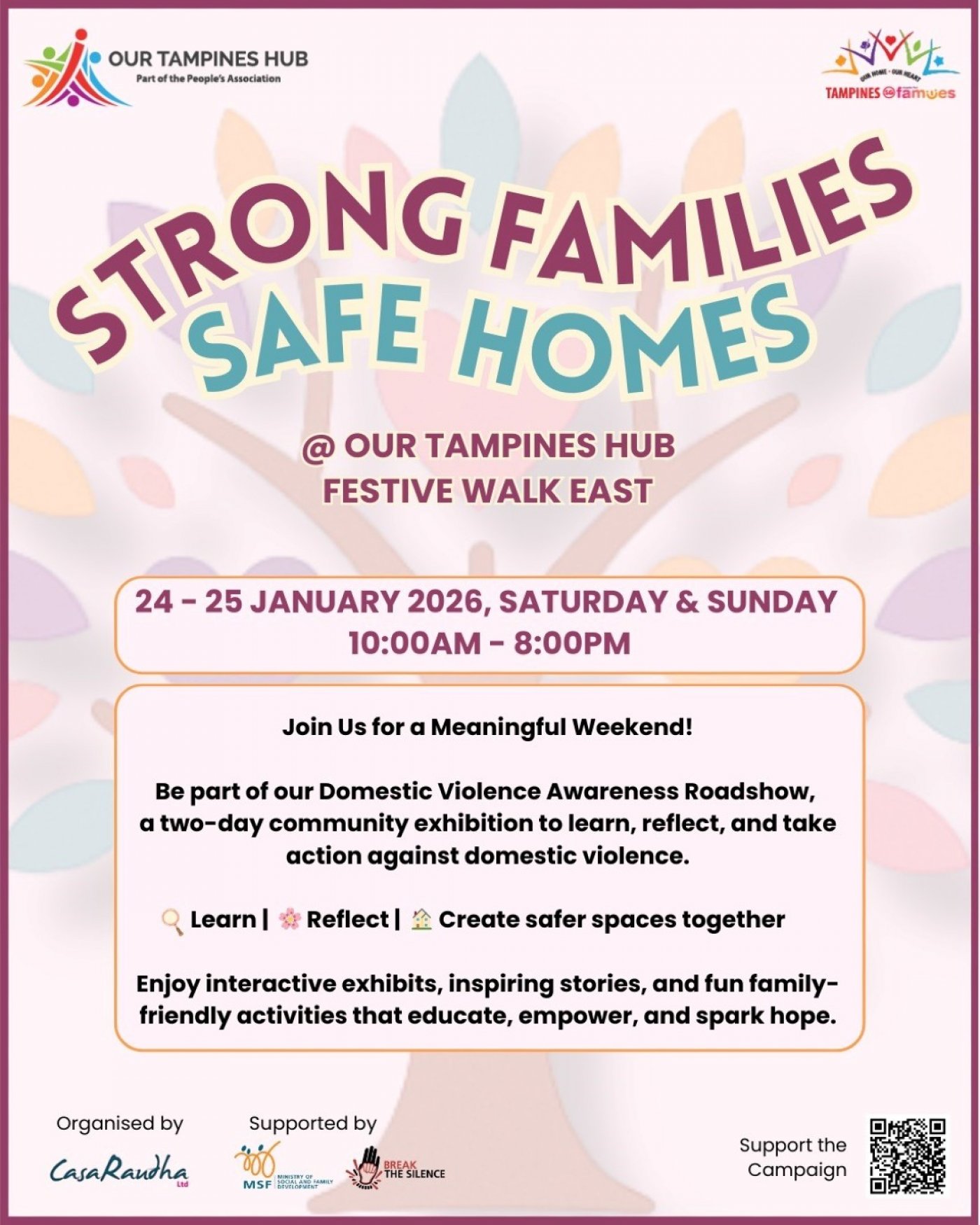 Organised by Casa Raudha and supported by the Ministry of Social and Family Development (MSF), this roadshow features interactive booths that educate visitors on detecting and preventing abuse in relationships. Our Guest-of-Honour Mr Goh Pei Ming, Minister of State for Social and Family Development, will also join participants at the roadshow on 24 January, 12.30pm.