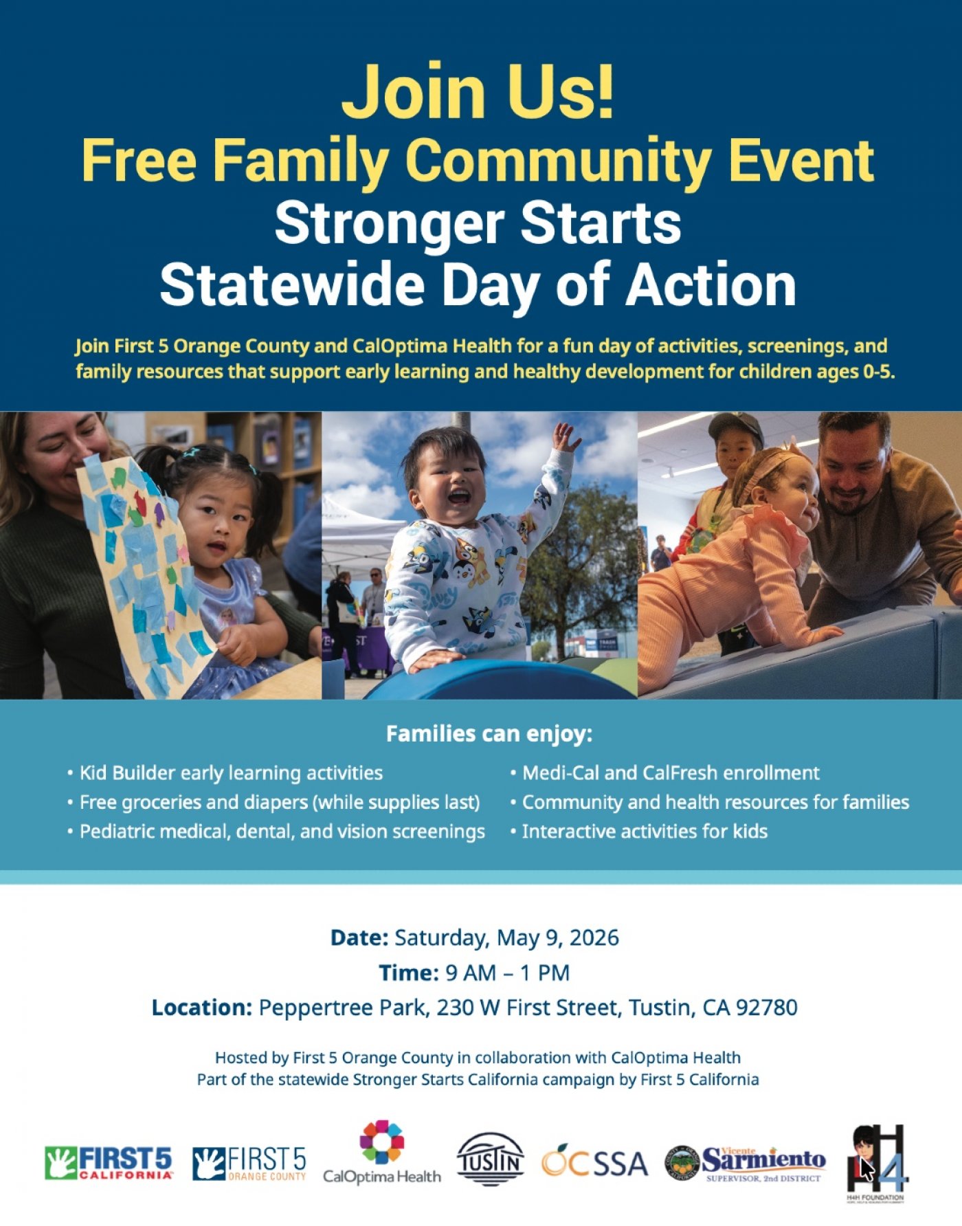 Hosted by First 5 Orange County in collaboration with CalOptima Health, this special day will bring together valuable resources, hands-on activities, and essential services. Families with children ages 0–5 can enjoy engaging early learning activities, interactive play, and access to important health screenings, including pediatric medical, dental, and vision services. Attendees will also have the opportunity to connect with local organizations, enroll in programs like Medi-Cal and CalFresh, and receive free groceries and diapers while supplies last.