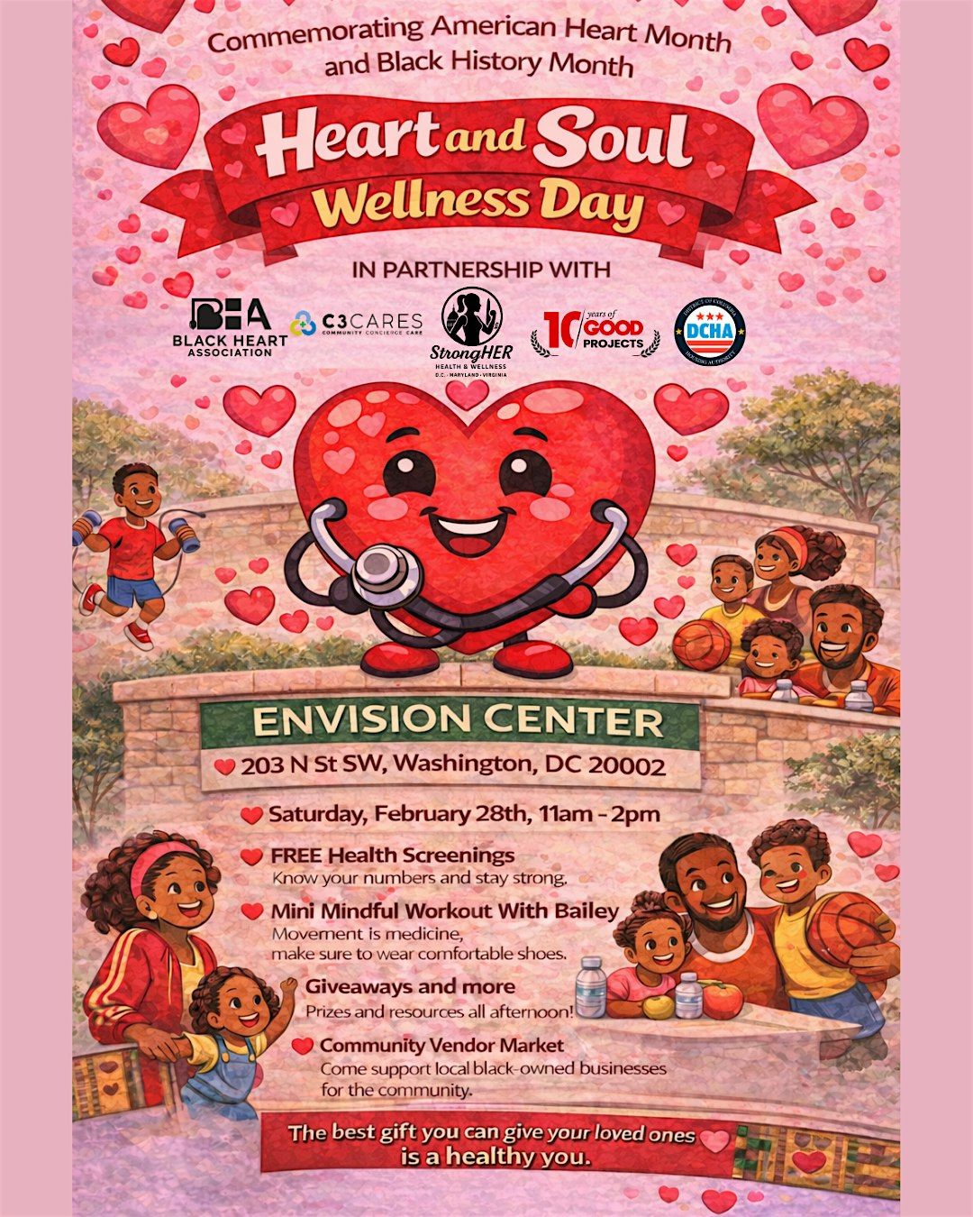 In celebration of the final weekend of both American Heart Month and Black History Month, I am thrilled to invite you and your communities to the StrongHER Heart and Soul Wellness Day. This special event is a collaboration between StrongHER and an incredible group of partners, including GOOD Projects DC, C3 Cares, Black Heart Association, DC Housing Authority, and DC Central Kitchen. Together, we are hosting a day of fun, fitness, and connection at The Envision Center in Southwest DC on Saturday, February 28th, from 11:00 AM to 2:00 PM.