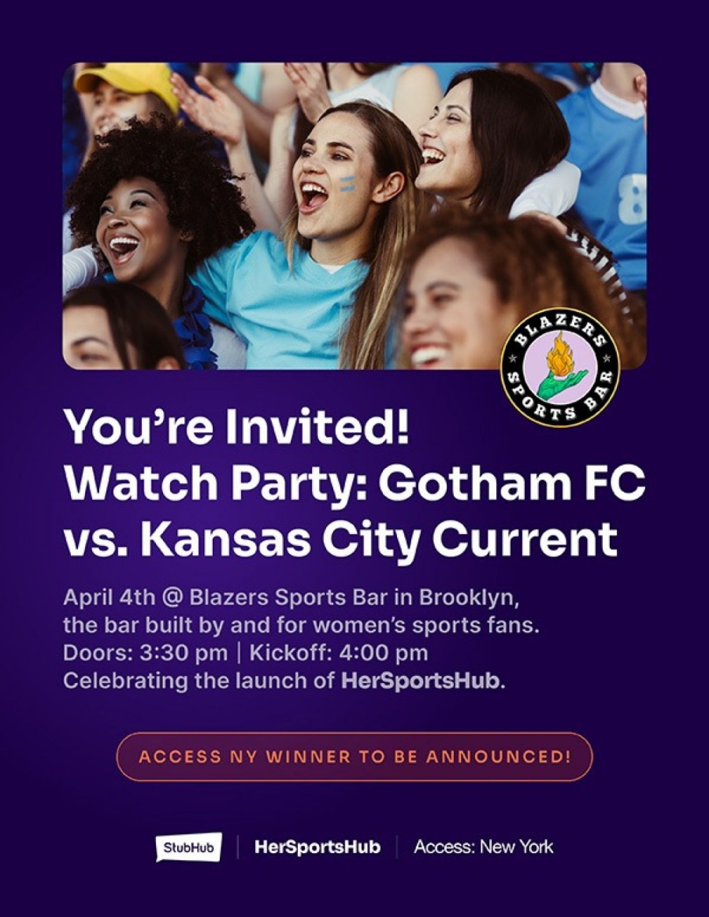 Join StubHub & Gotham FC for a Women’s Sports Watch Party at Blazer’s Sports Bar in Brooklyn on 4/4. Enjoy drinks, bites, and merch while watching the soccer match, plus a raffle for NY Sirens tickets at MSG.