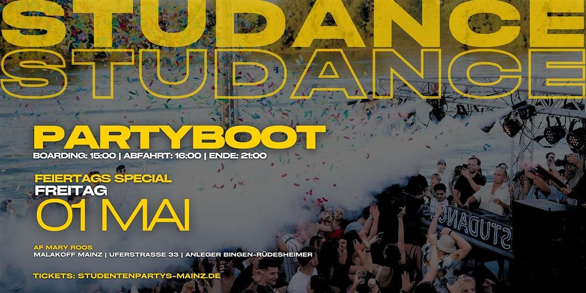 Am Freitag, den 01.05 2026, stechen wir wieder mit unserem Studance PARTYBOOT in See! Bei bester Stimmung starten wir um 16.00 Uhr (Boarding ab 15.00 Uhr) in Richtung Rüdesheim und tanzen gemeinsam in den Sonnenuntergang.