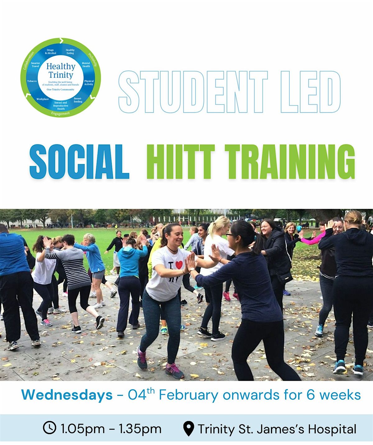 A social half hour of exercises, led by students. Green area outside Trinity St. James's Centre. All welcome, FREE to attend.