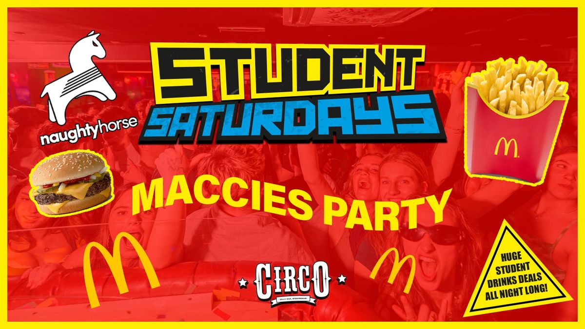 Selly Oak's FIRST EVER MacDonald's Party - expect FREE FRIES, BURGERS, NUGGETS + more!Birmingham's biggest student promoter has teamed up with the legendary student only venue CIRCO to give you weekly Saturday nights ... with THE BEST SATURDAY NIGHT STUDENT DRINKS OFFERS and no more taxis needed!Expect all your Naughty Horse favourites across the year with FREE T-SHIRTS, BUCKET HATS, THEMED NIGHTS, MASSIVE GIVEAWAYS + much much more!£3.50 select bottles and pints! 2 shots for £3.50 AND £5.50 select doubles all night long!