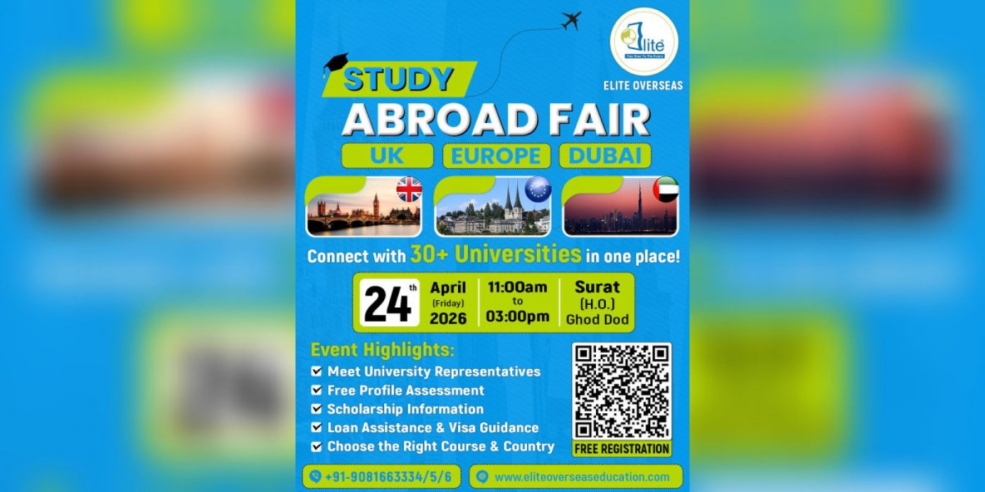 Elite Overseas proudly presents the mega Study Abroad Fair in Surat on 24 April 2026 (Friday). This exclusive event allows students to connect directly with 30+ top universities from the UK, Europe, and Dubai — all under one roof.