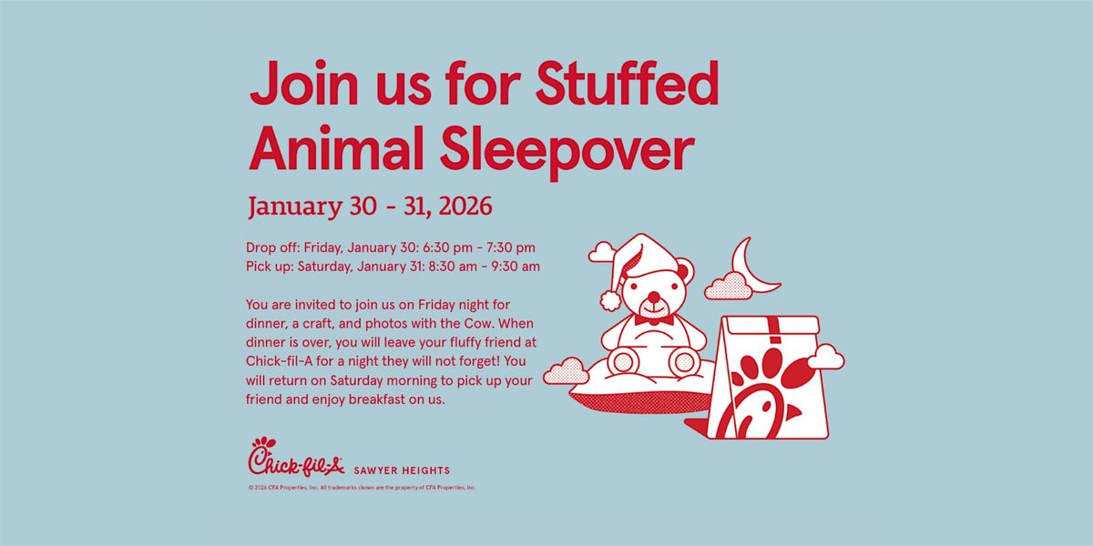 You are invited to join us on Friday, January 30th, from 6:30 pm -7:30 pm for dinner, a craft, and photos with the Cow. When dinner is over, you will leave your fluffy friend at Chick-fil-A for a night they will not forget! You will return on Saturday, January 31st, from 8:30 am to 9:30 am to pick up your friend and enjoy breakfast on us.