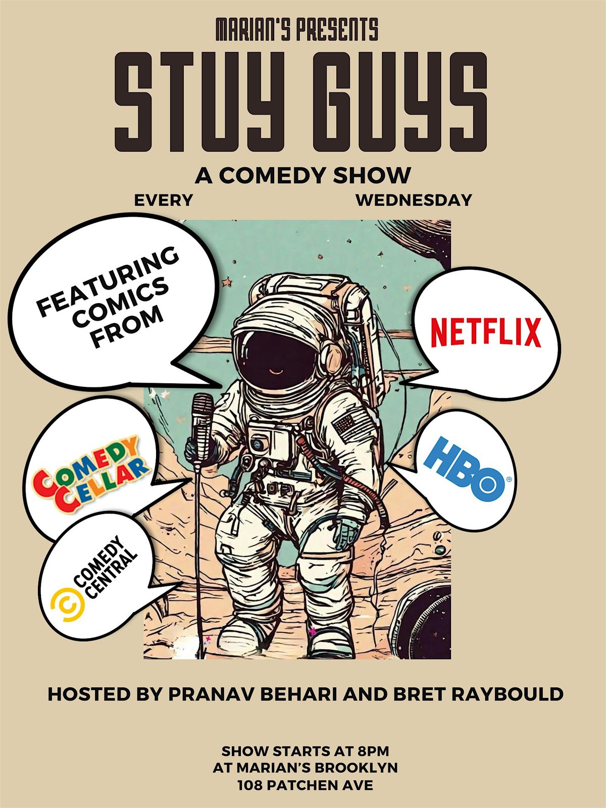 Every Wednesday, comedians Pranav Behari (HBO, Mango Bae Podcast) and Bret Raybould (Comedy Central, SiriusXM), and James Mwaura (Just for Laughs) bring big laughs to Marian's in Bed Stuy.